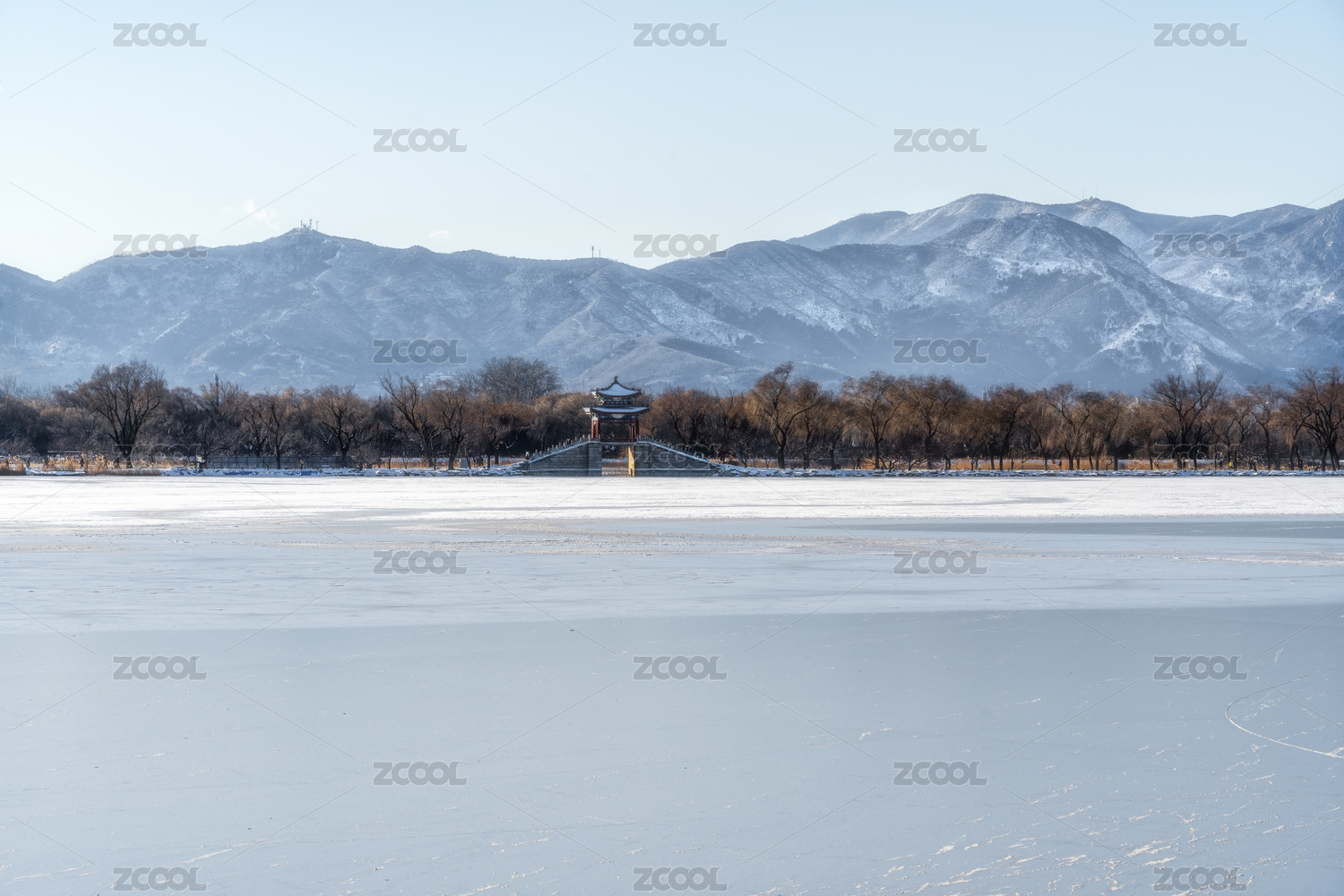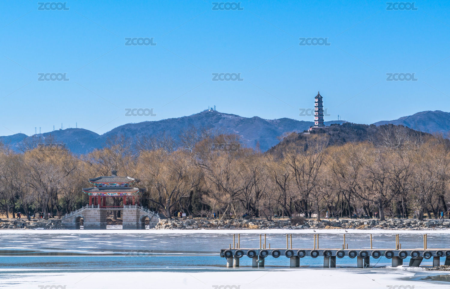 北京市颐和园昆明湖堤岸石桥园林冬季风光