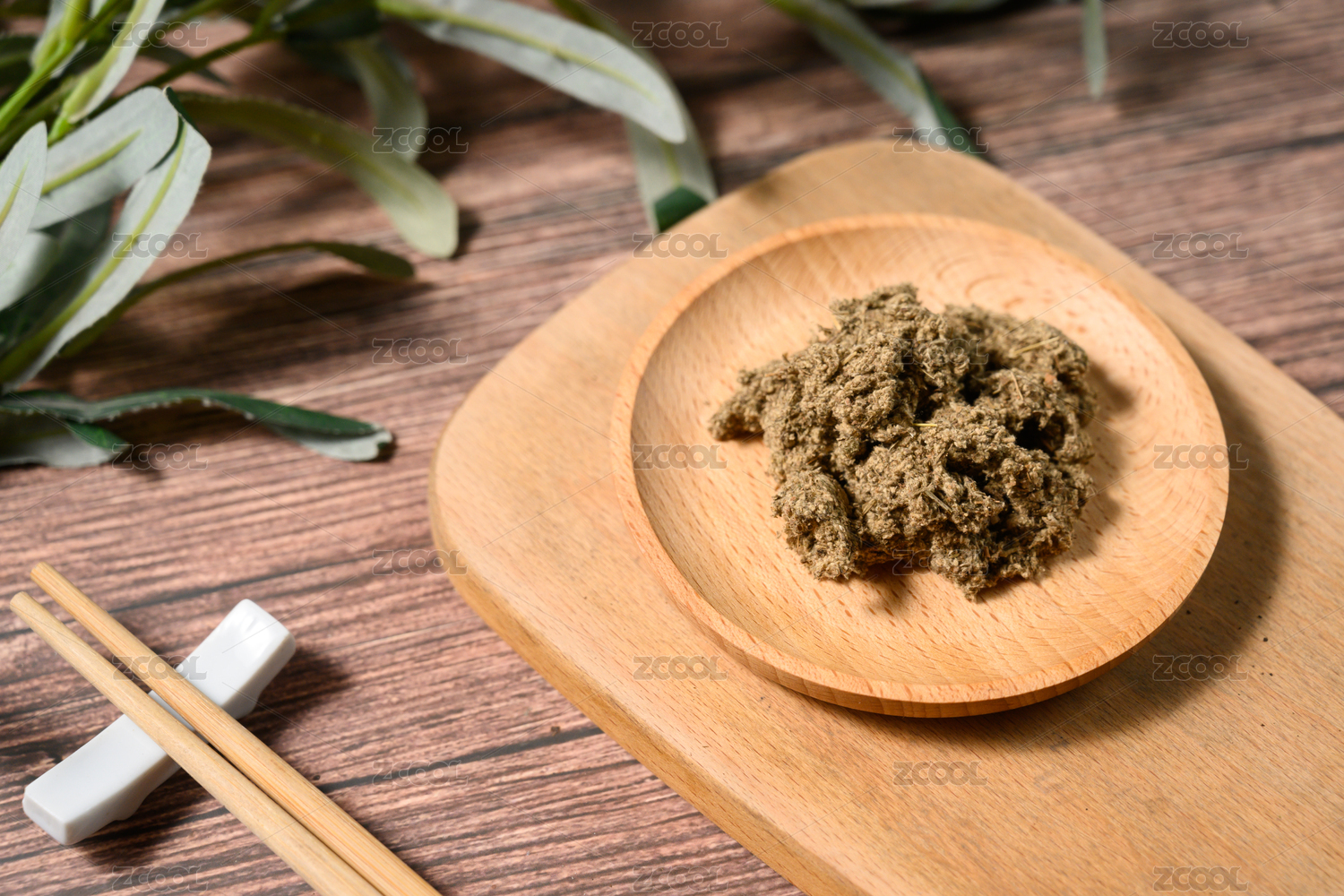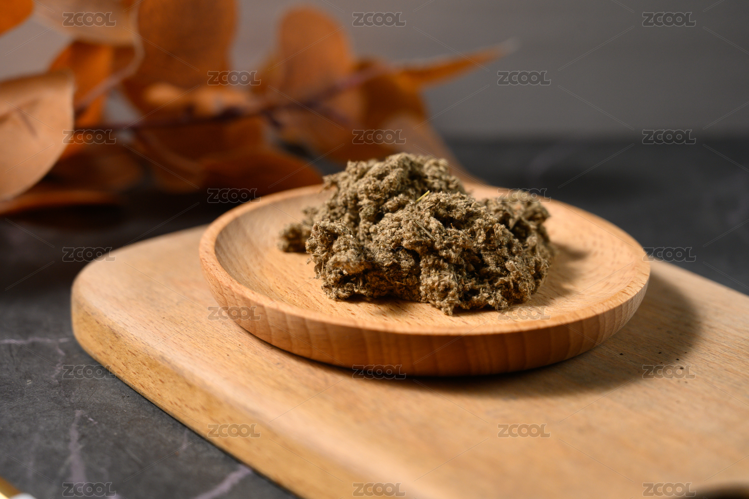 桌面上的盘子里的香气四溢的艾草绒
