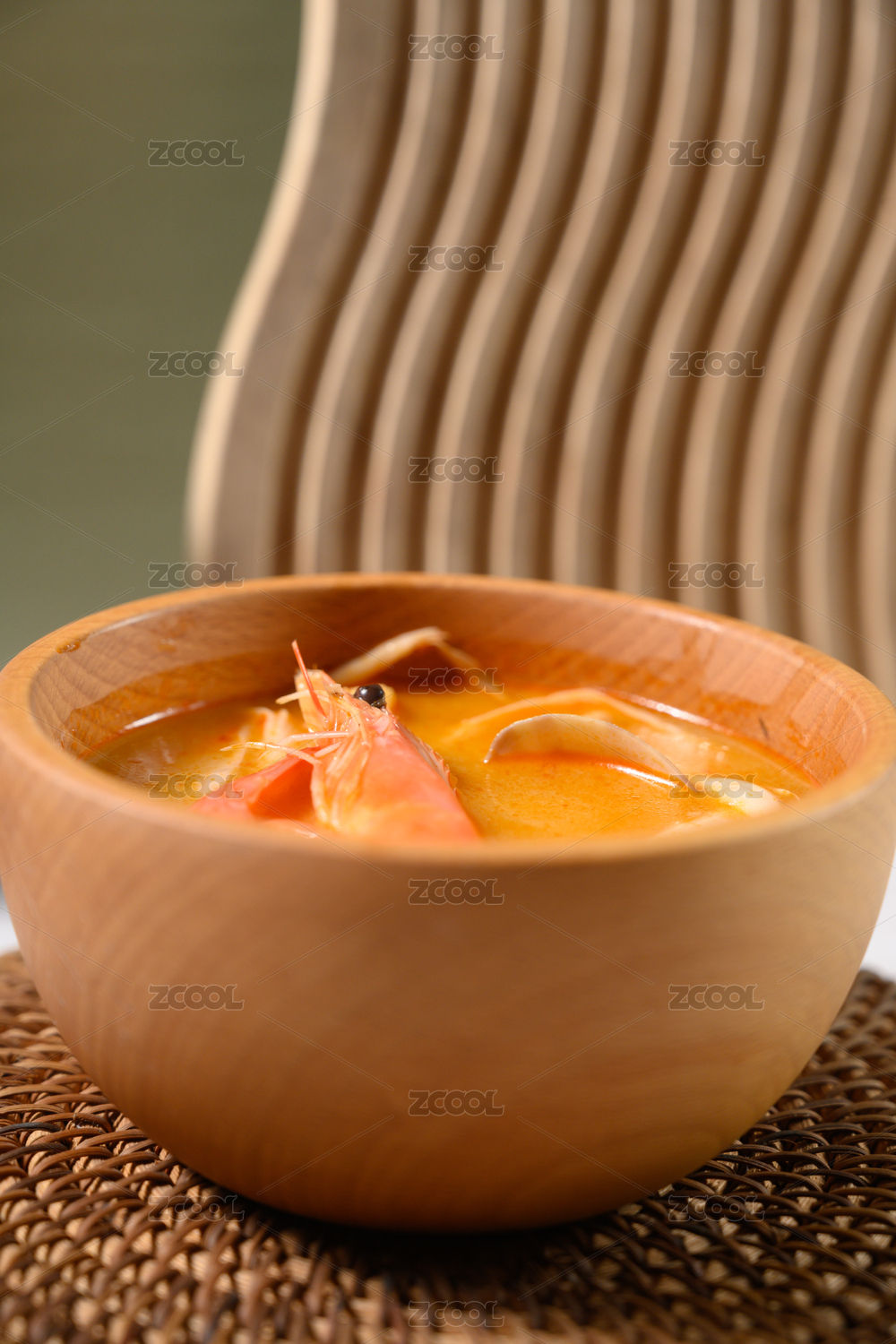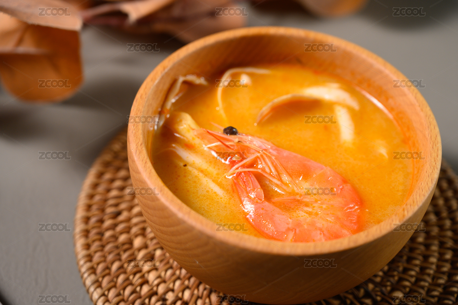 桌面上的碗里的美味可口的冬阴功汤