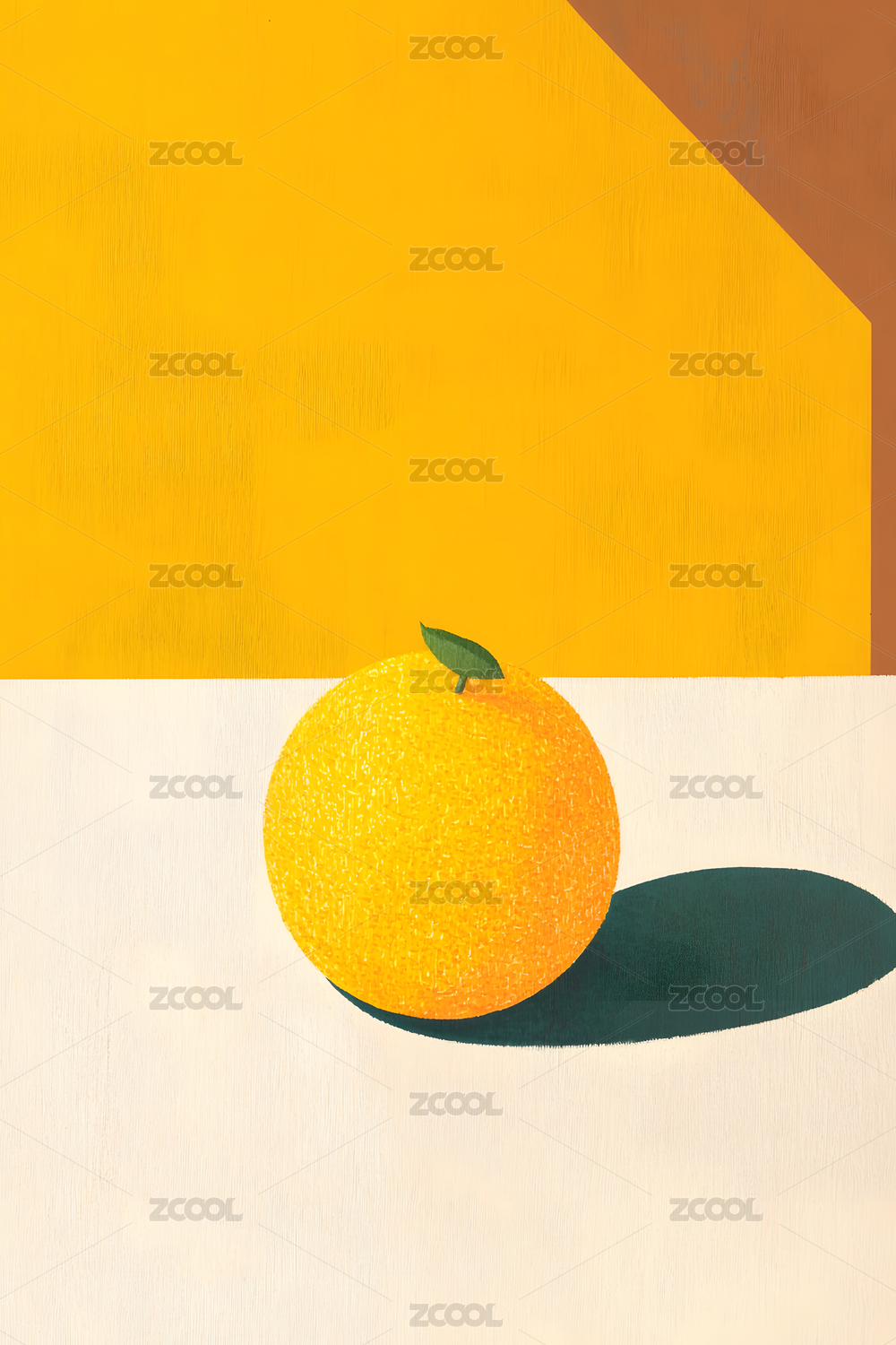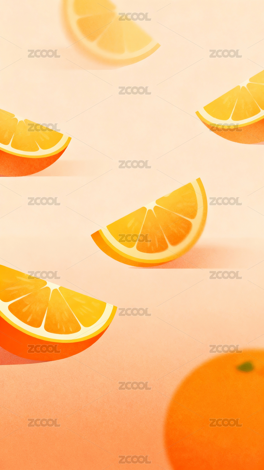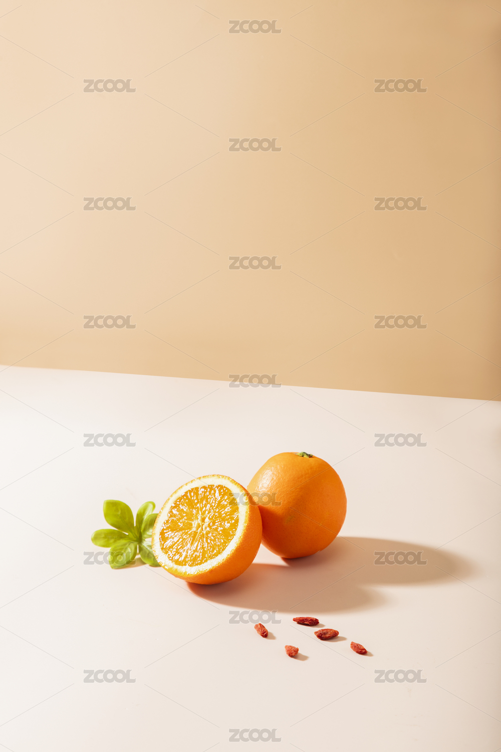 色彩柔和背景上鲜亮橙色水果和绿叶