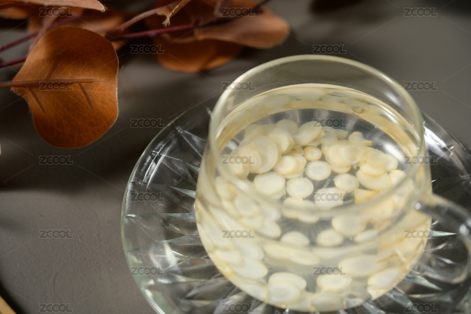 桌面上的杯子里的的甘甜可口的西洋参茶