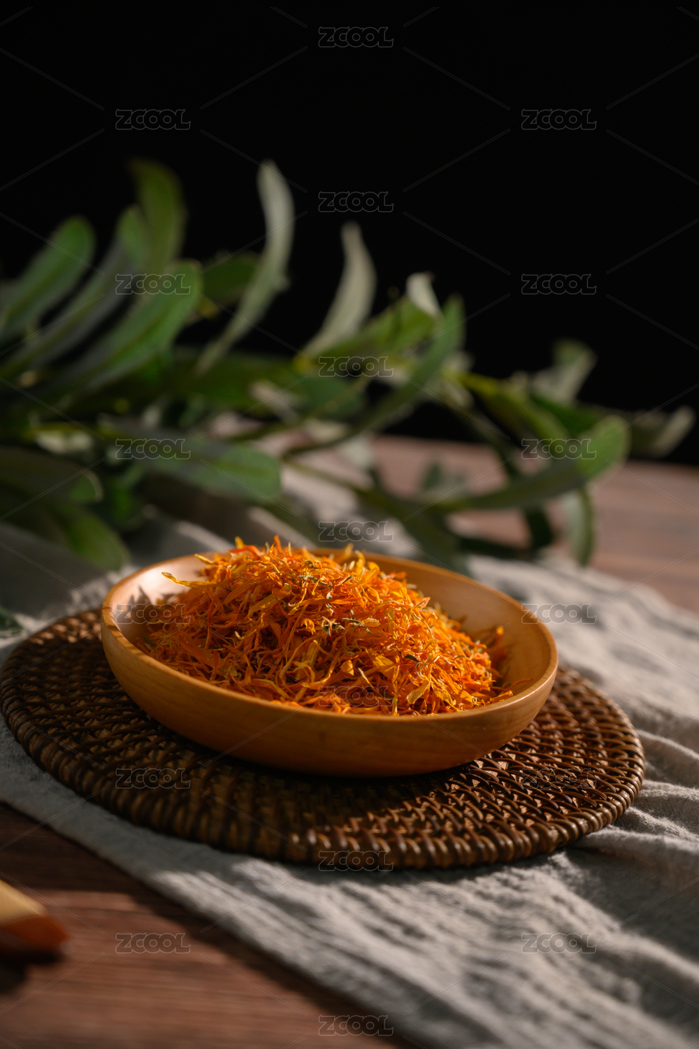 桌面上的盘子里的干爽的金盏菊花花瓣