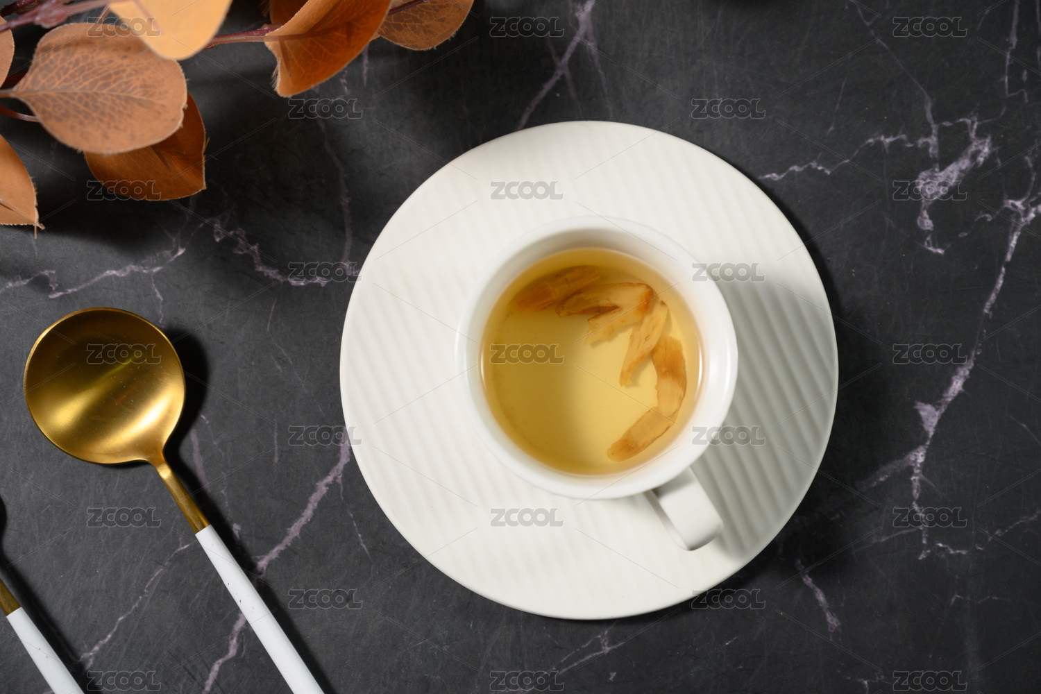 桌面上的杯子里的甘甜可口的金盏菊花茶