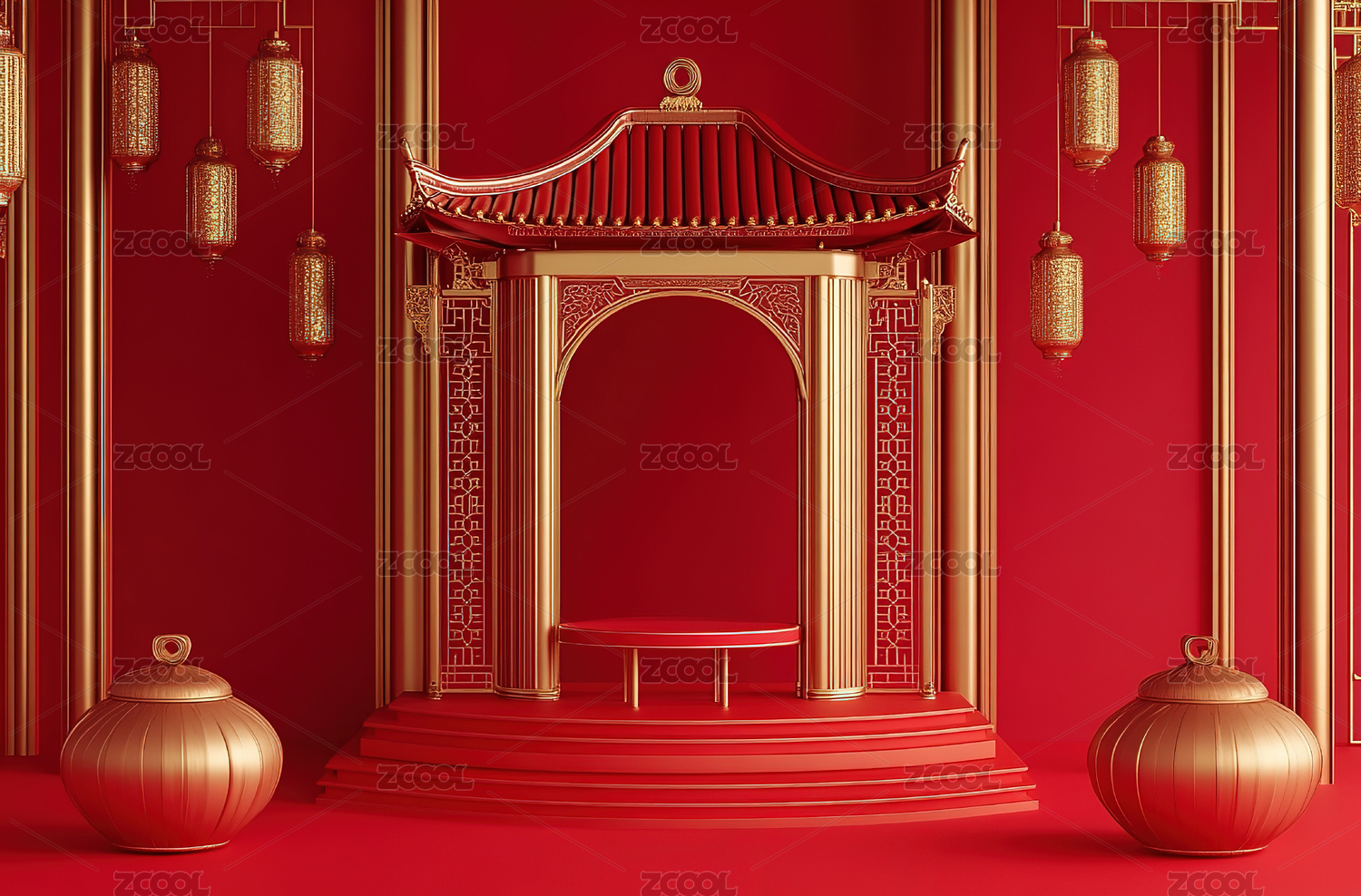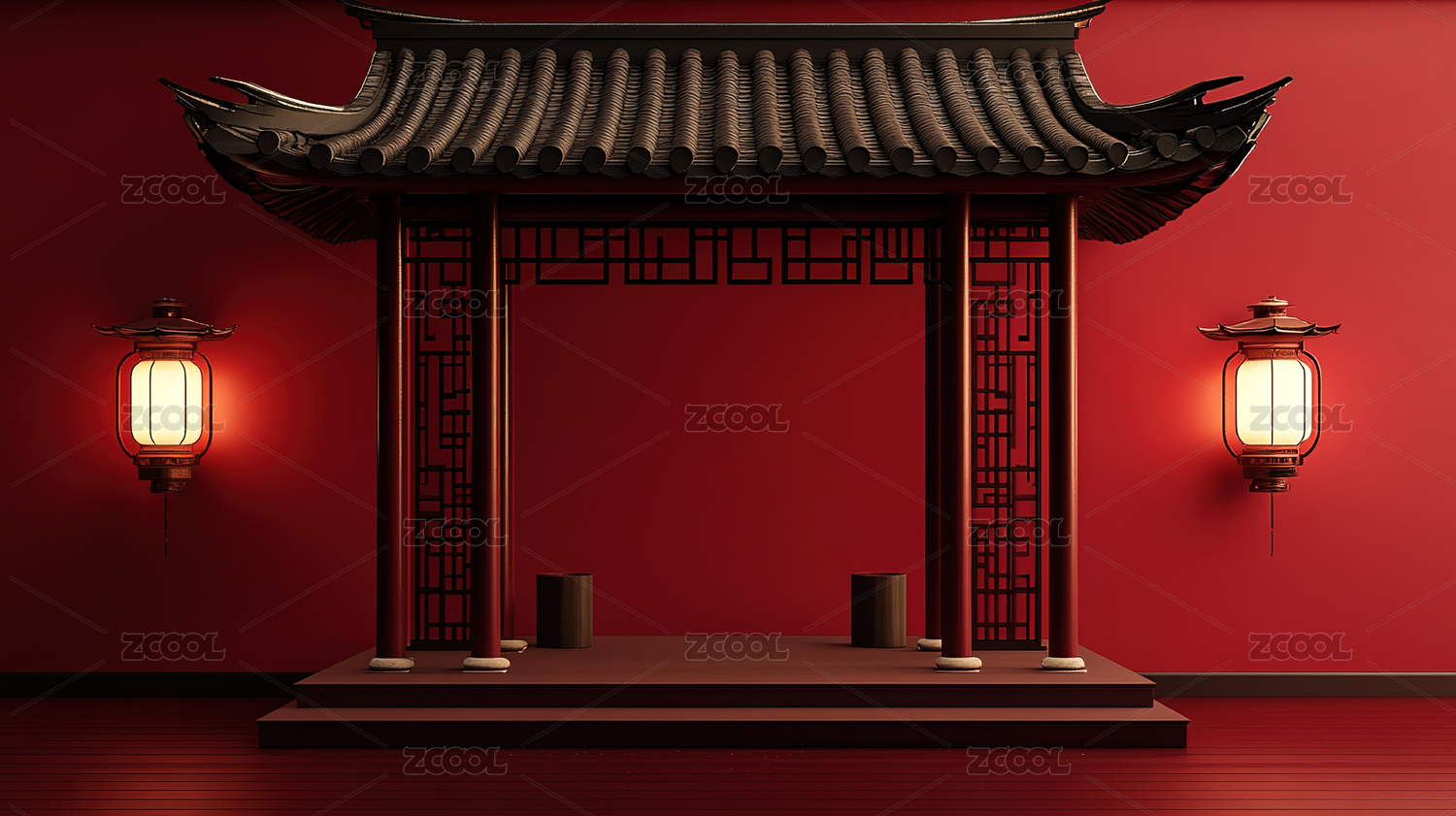红色背景中国传统古建筑门楼中式产品展示台