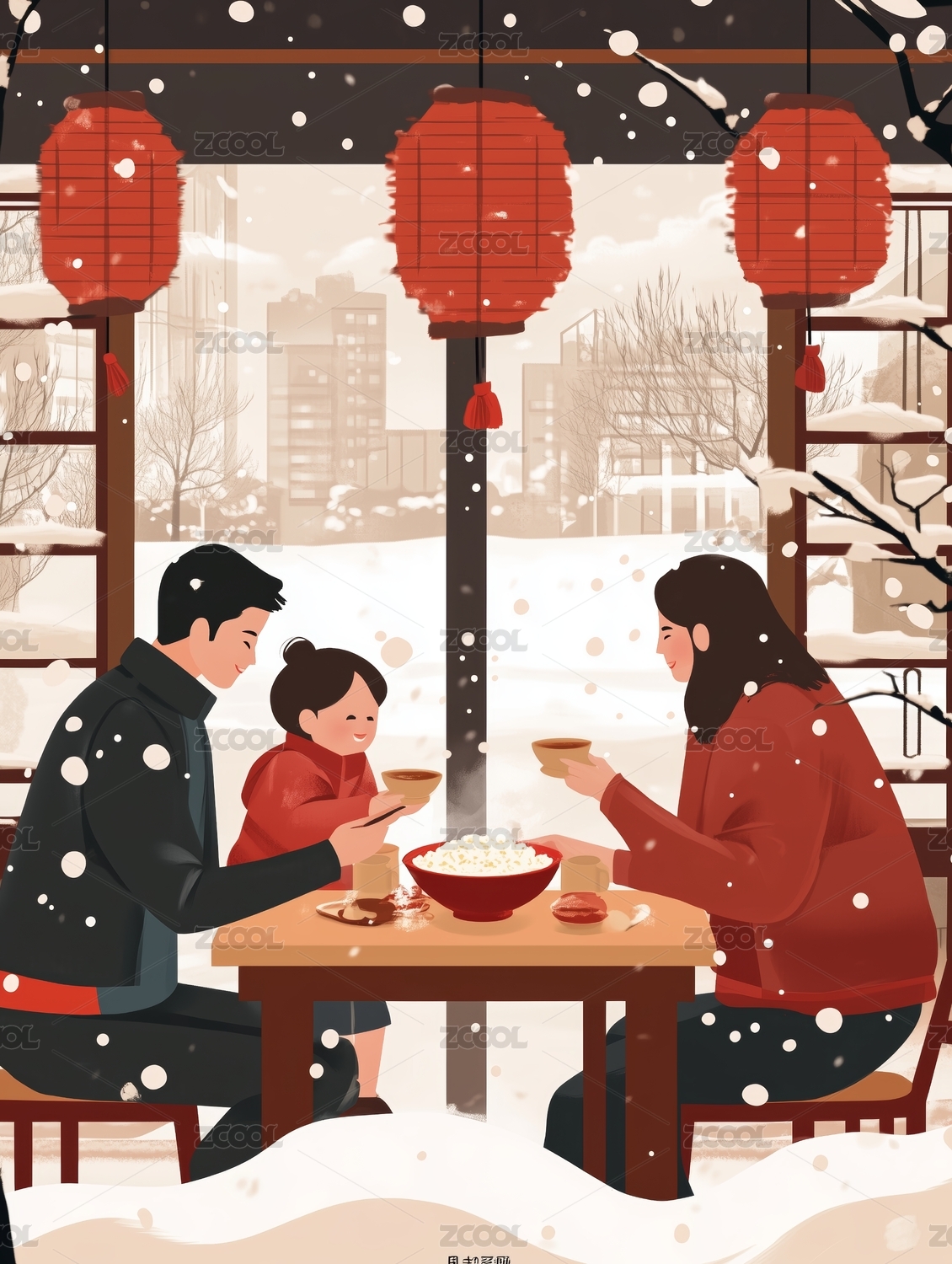 冬季传统节气风景一家人围坐在餐桌旁吃饭