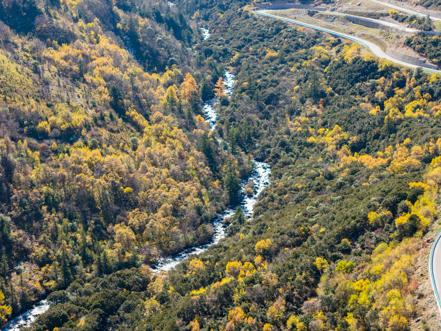 中国甘肃甘南夏河达宗圣湖秋天森林航拍风光