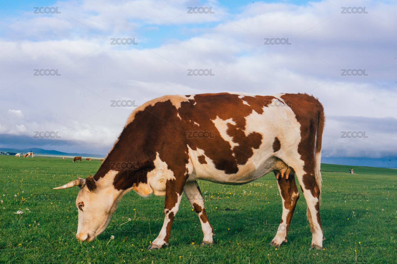 夏季草原上吃草的牛