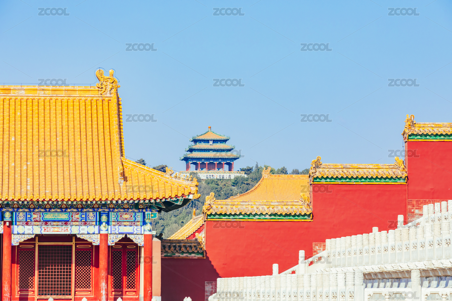 从北京故宫内眺望景山公园山顶