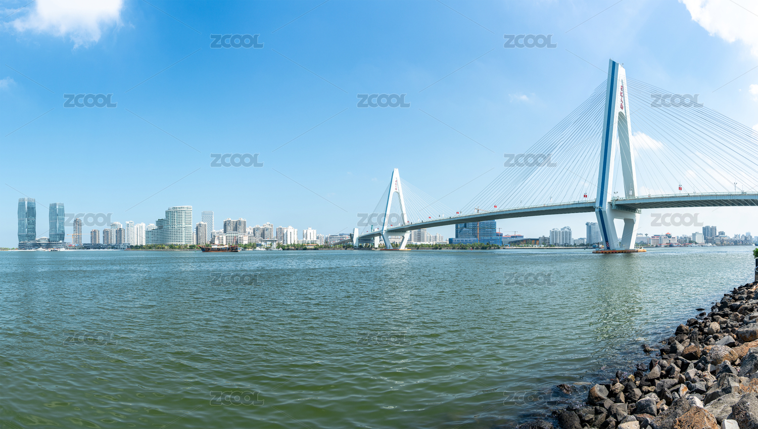 中国海南海口海甸河世纪大桥高视角晴天风光