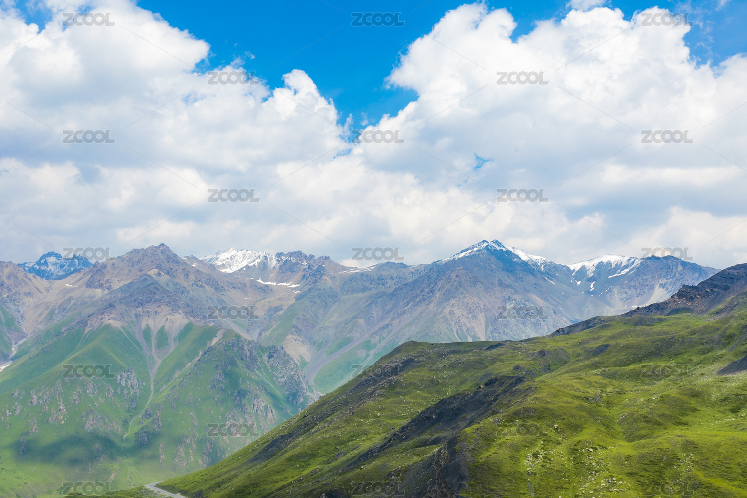 中国新疆夏季蓝天白云下G217独库公路沿途高山草原