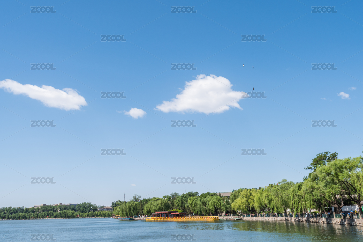 中国辽宁沈阳北陵公园的园林湖泊和游船