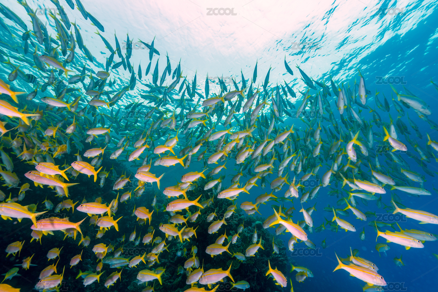 夏季白天埃及红海水下珊瑚礁与鱼群