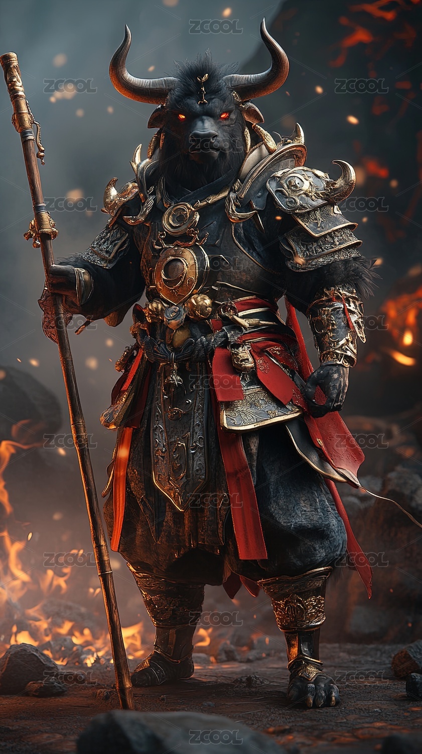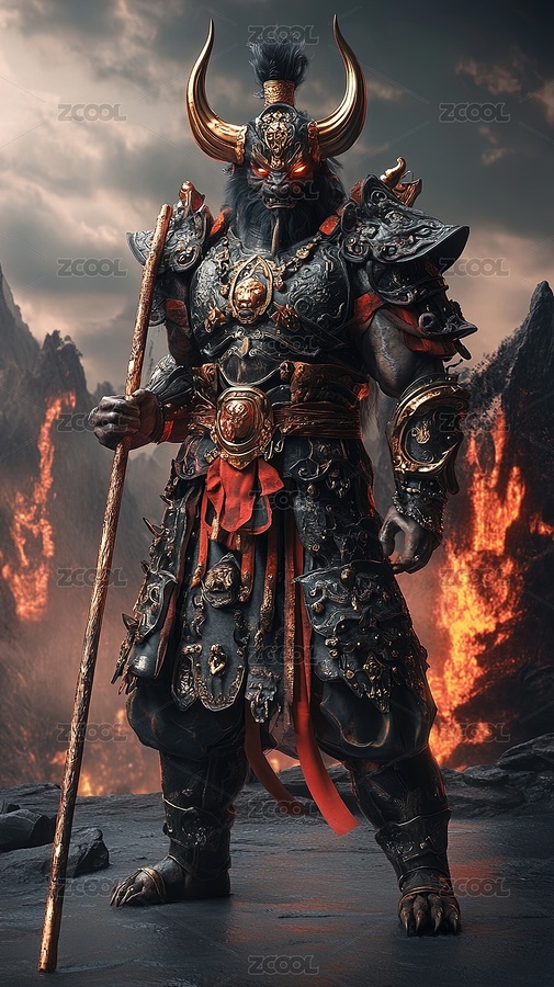 牛魔王,牛头人,野蛮人,妖怪,妖精,魔王,黑暗背景,火焰山,燃烧,盔甲