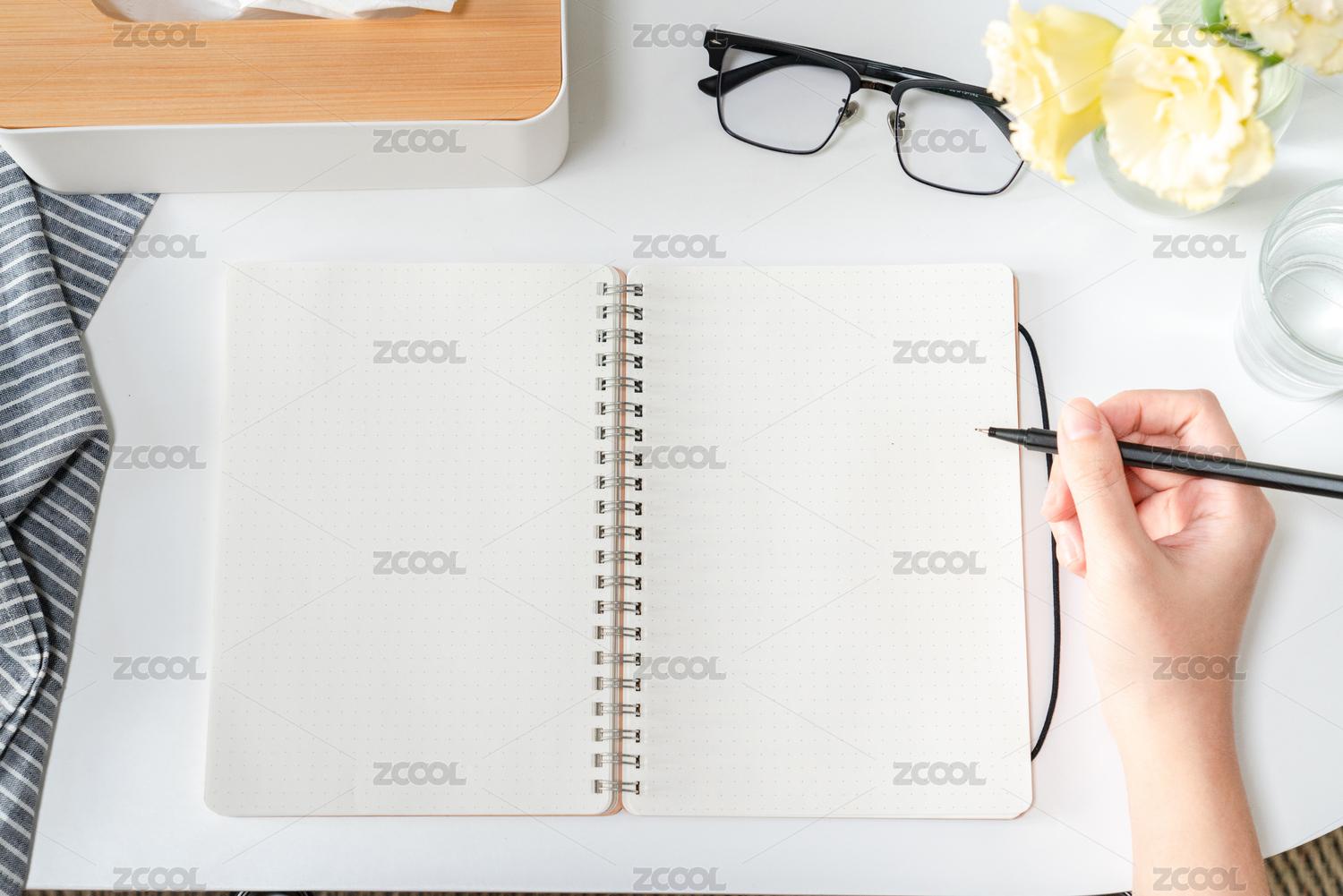 在摆放着眼镜、水杯等物品的桌面上 书写的场景