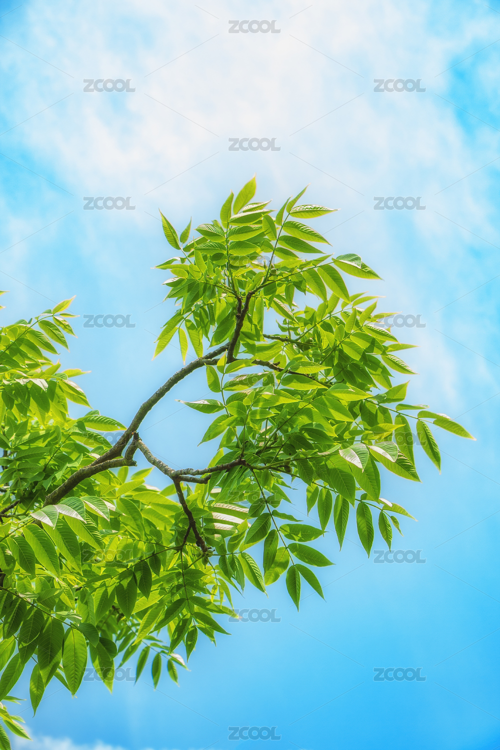 夏天晴朗的天气,蓝天下的一枝嫩绿的核桃叶