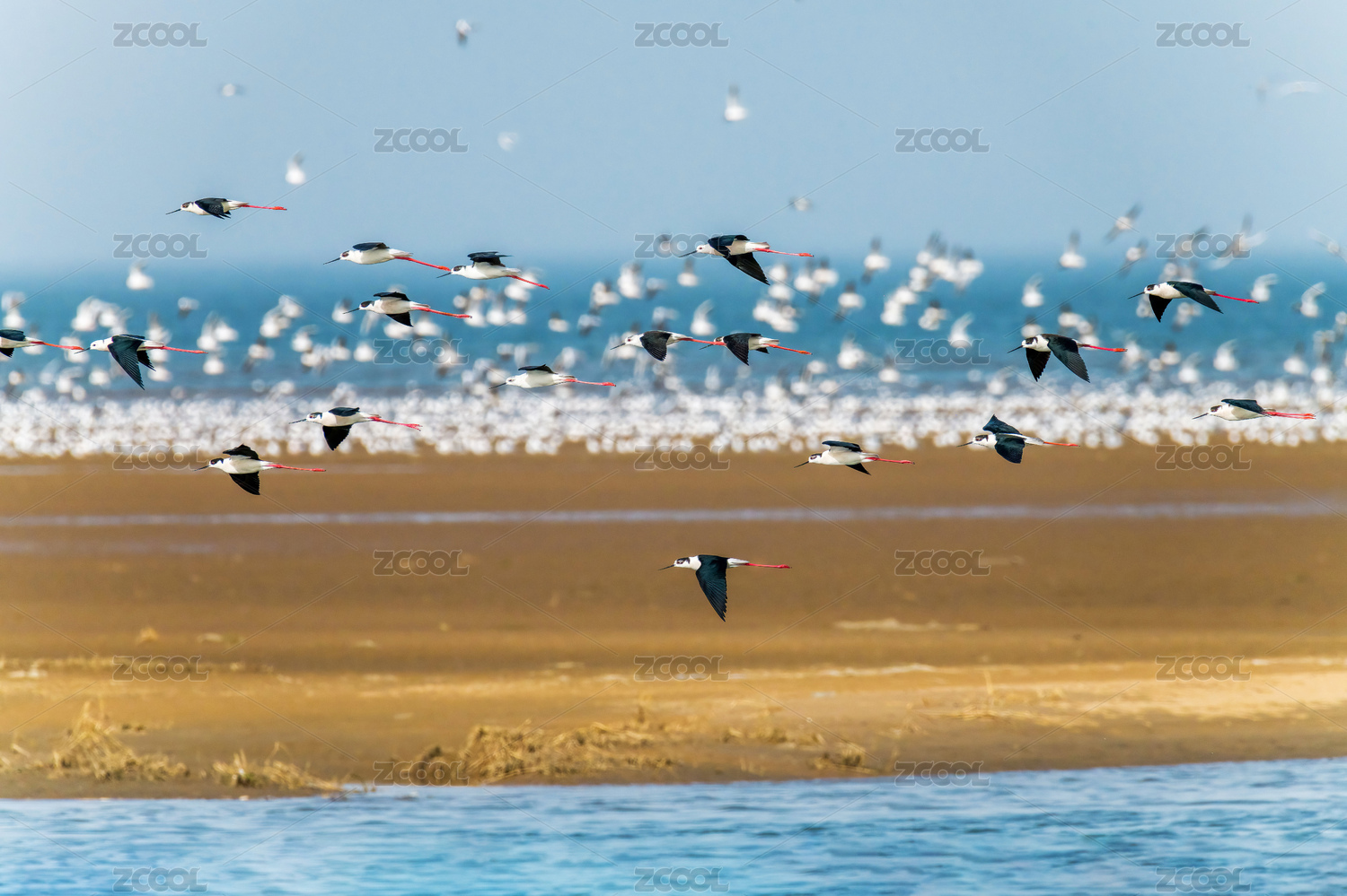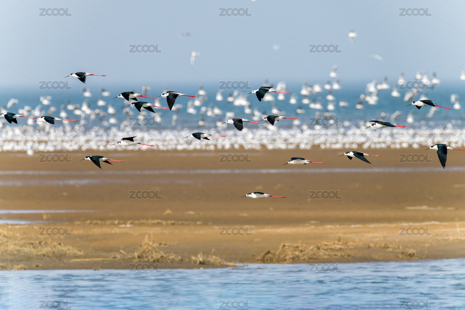 中国河北省秦皇岛市北戴河湿地黑翅长腿鹬群