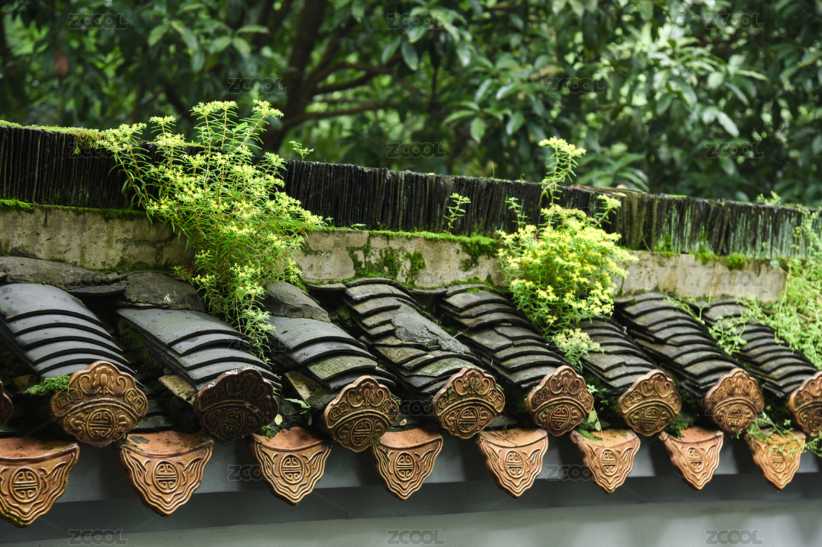 初夏公园古建筑阳光下屋顶瓦缝间的植物