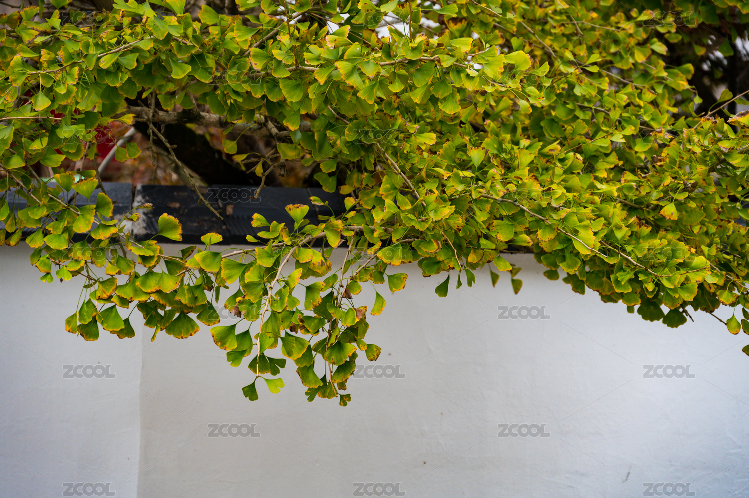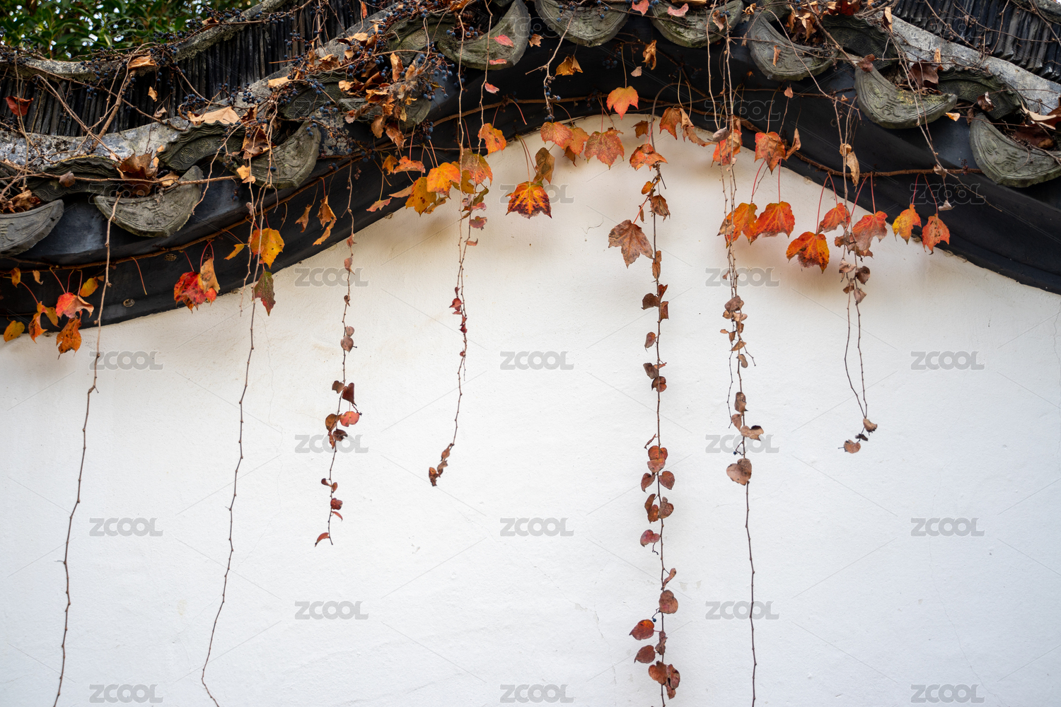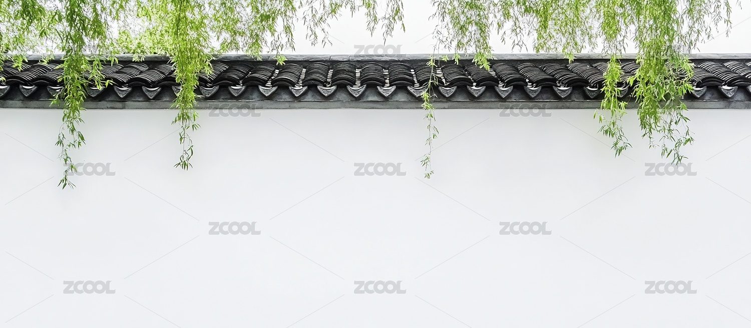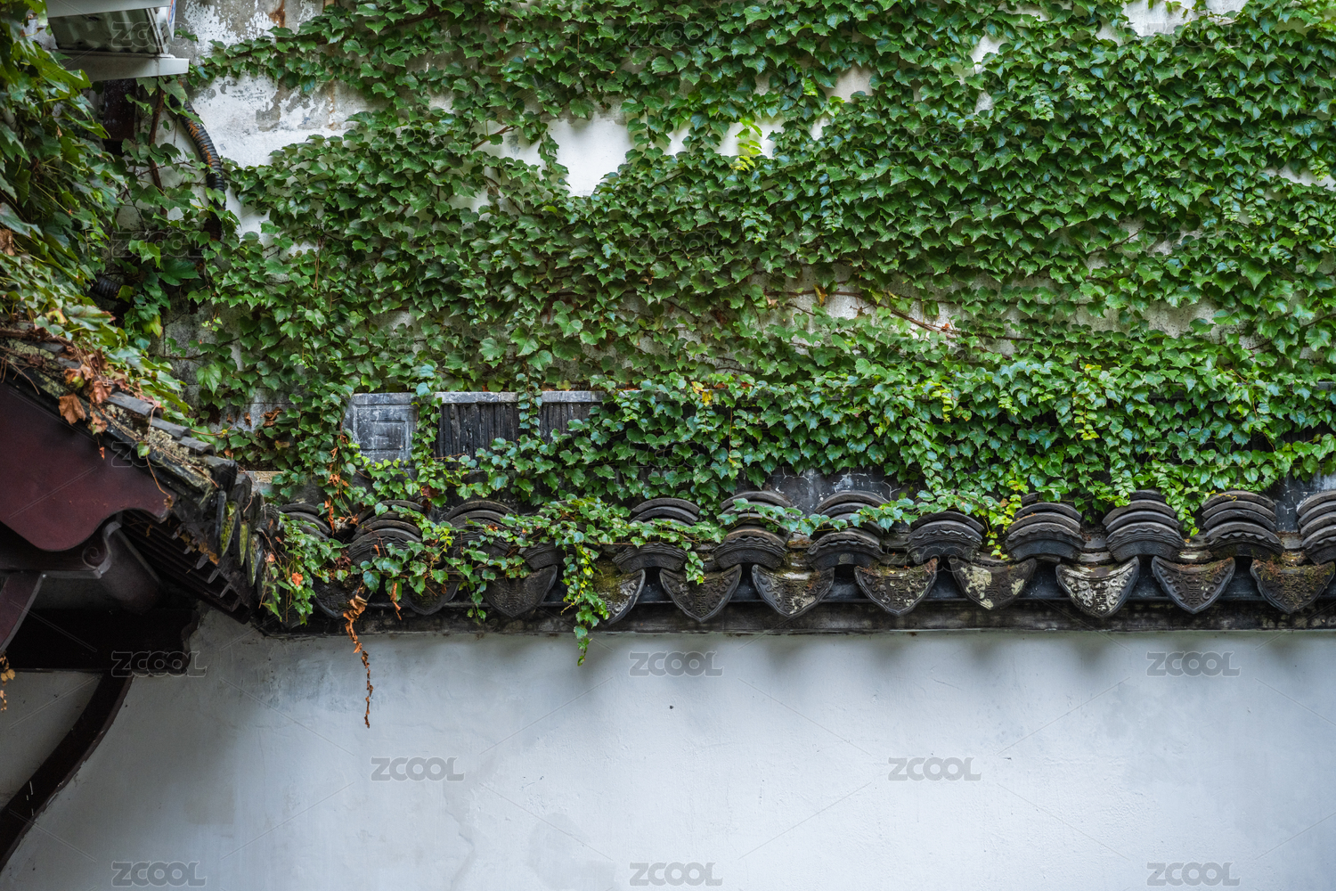 初夏公园古建筑阳光下屋顶瓦缝间的植物