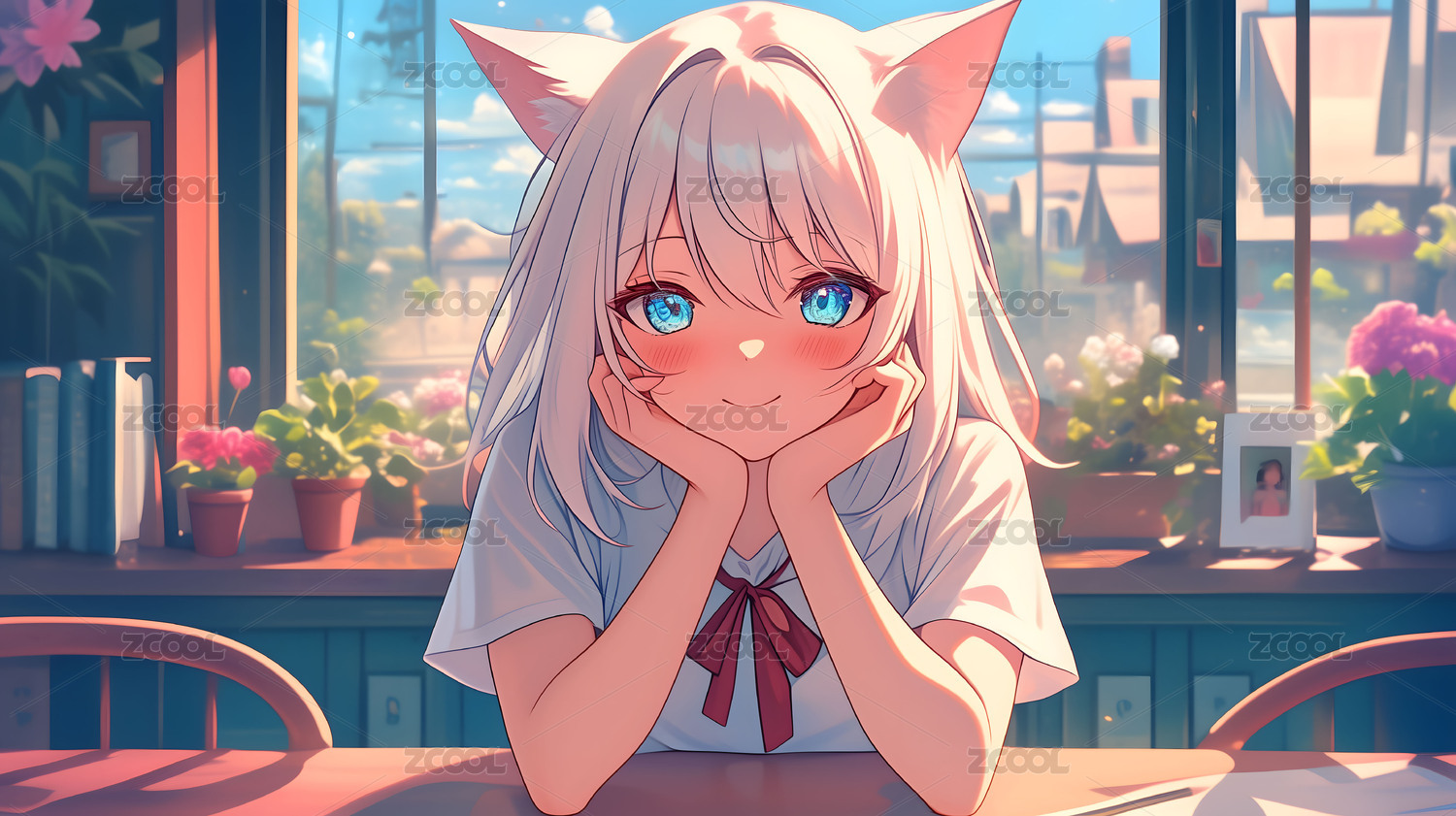 女孩,清新,温馨,二次元,少女,花盆,兽耳,花园