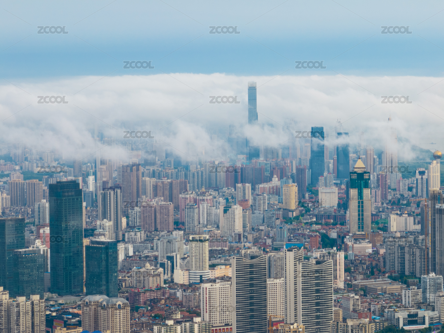航拍夏季武汉暴雨后云雾中的城市风光