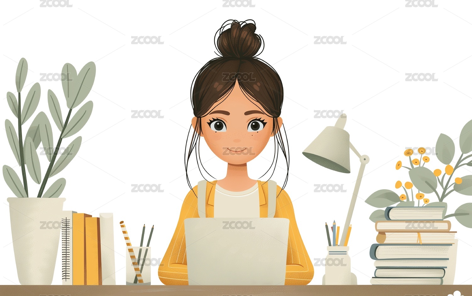 卡通可爱女生电脑办公插画