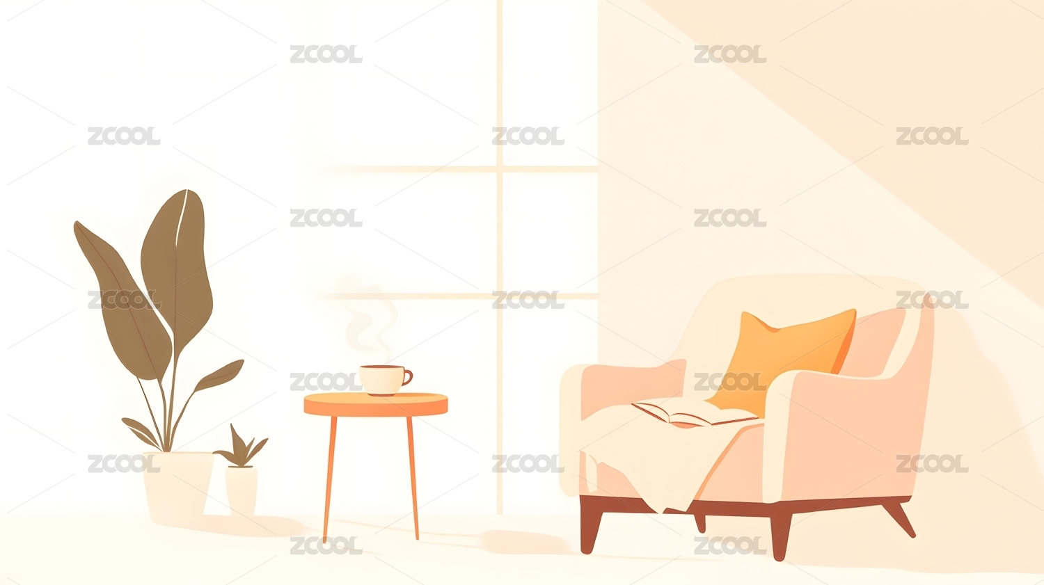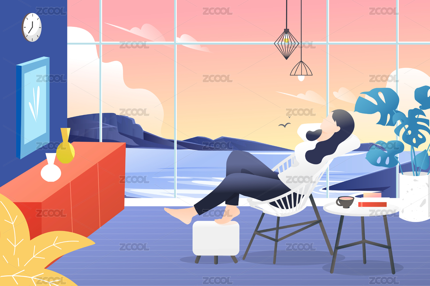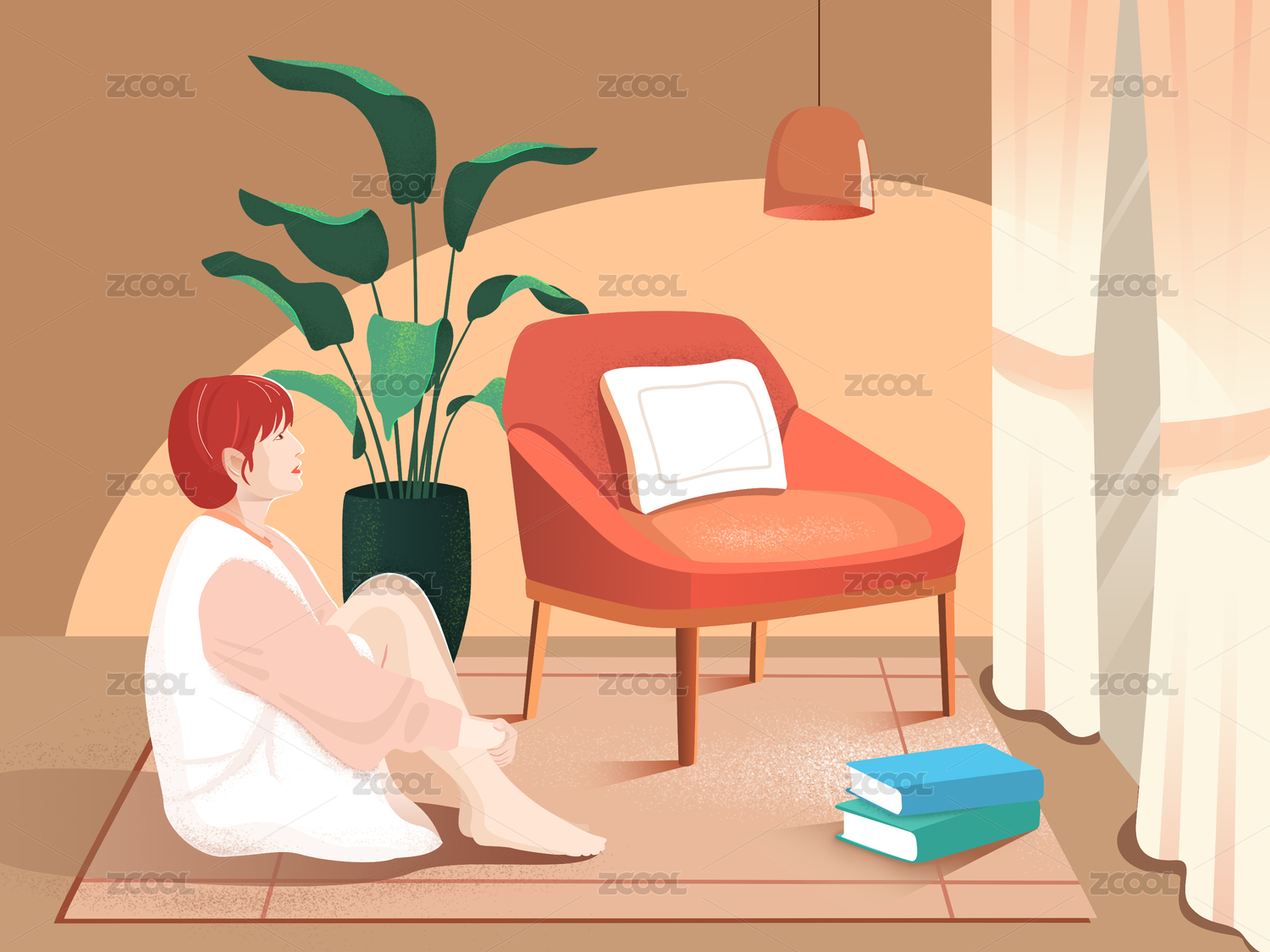 一个女生抱腿坐在地毯上望向远方思考旁边有琴叶榕和书,暖色调插画