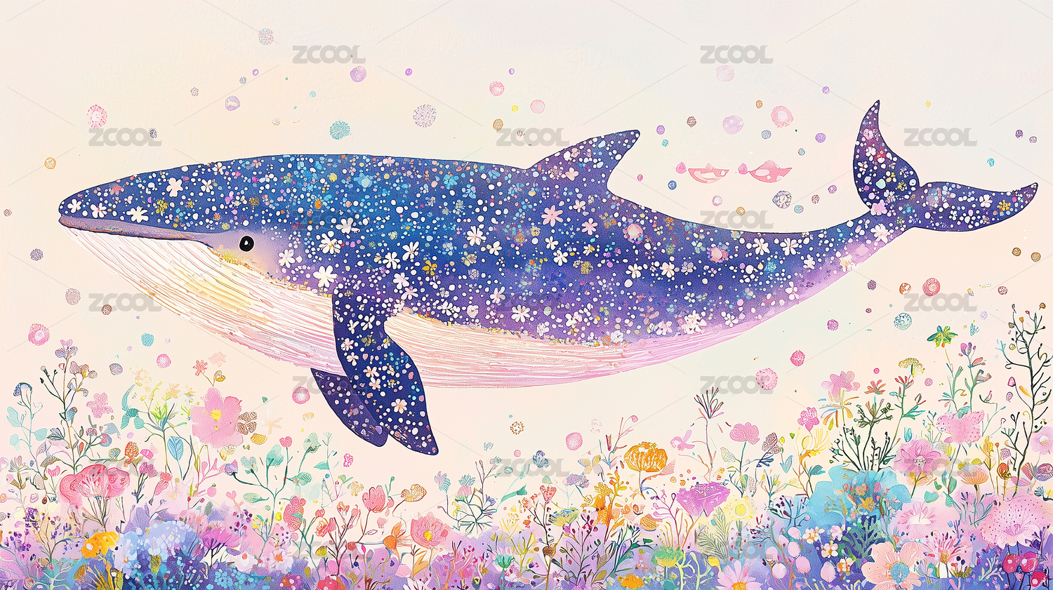 花中童话鲸鱼卡通插画