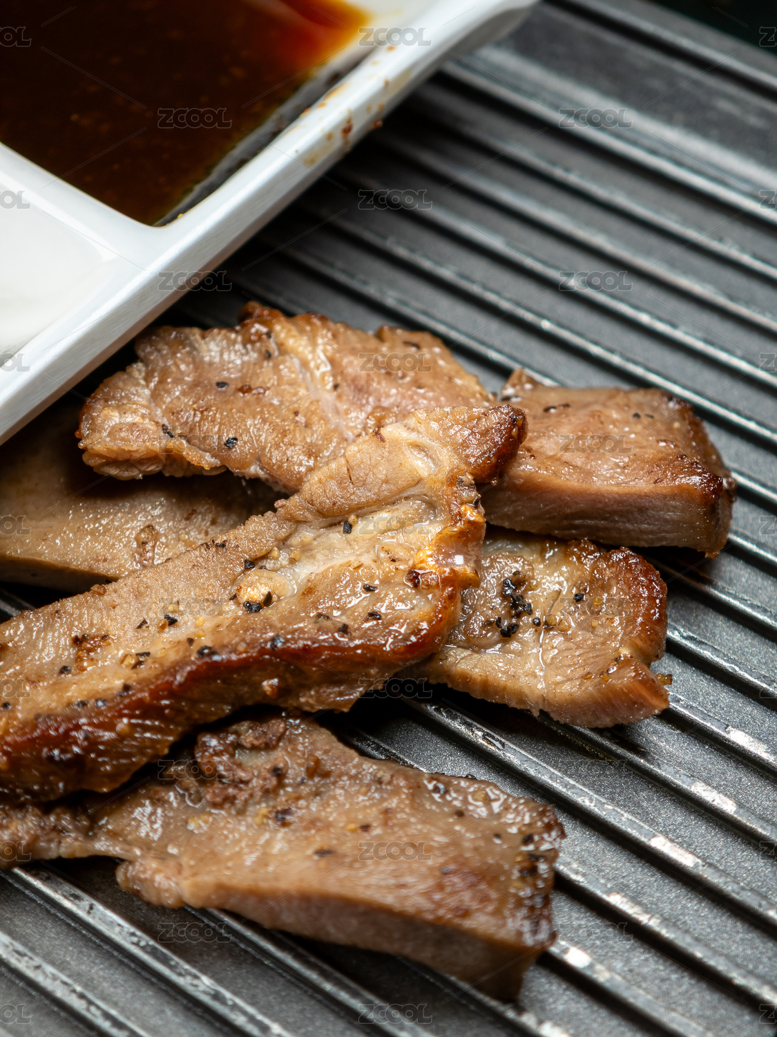 铁板烤架上的厚切日式烤牛舌与蘸料