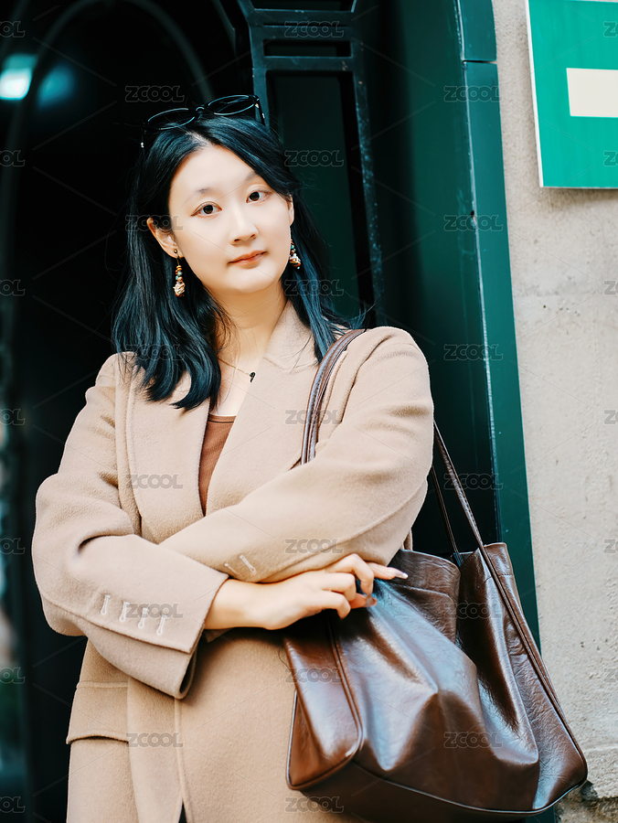 时尚女性,城市肖像,棕色手提包,时尚服装,外套,优雅,街头风格,当代时尚,城市生活方式,配饰