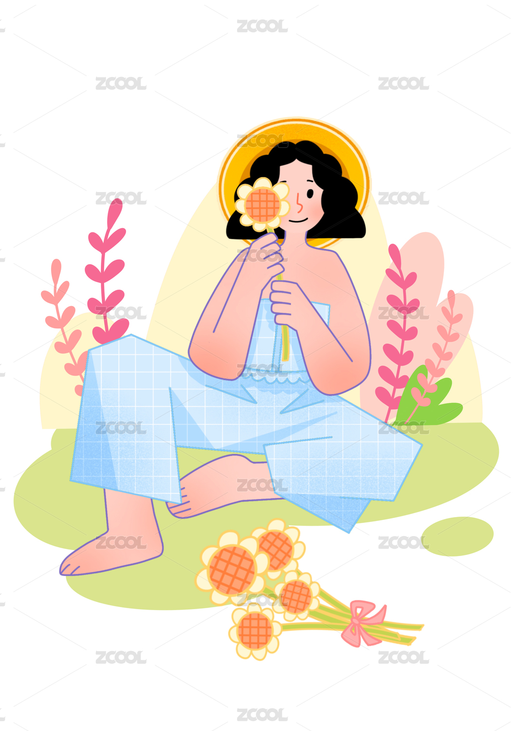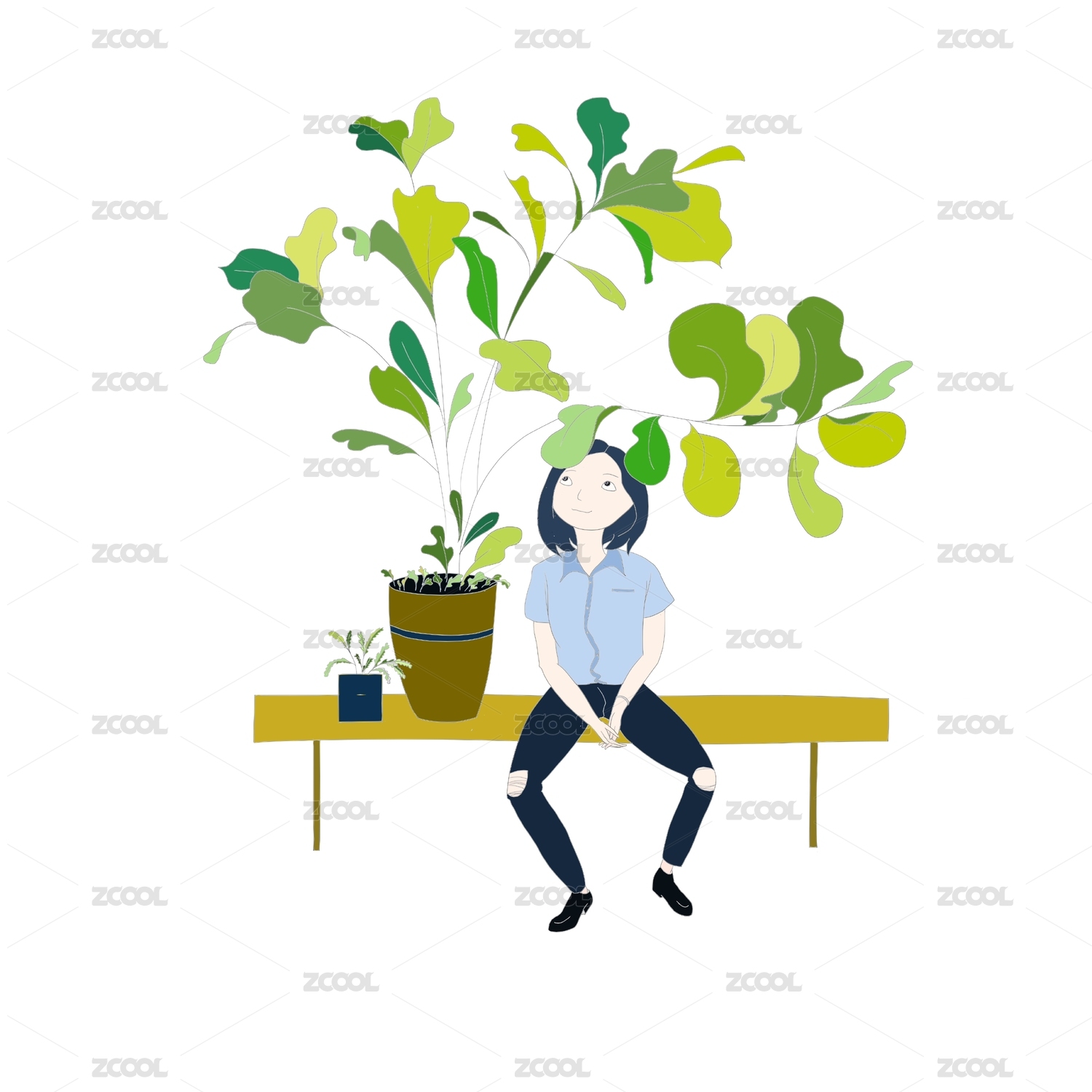 与绿植盆栽并肩坐在长凳上的短发女孩