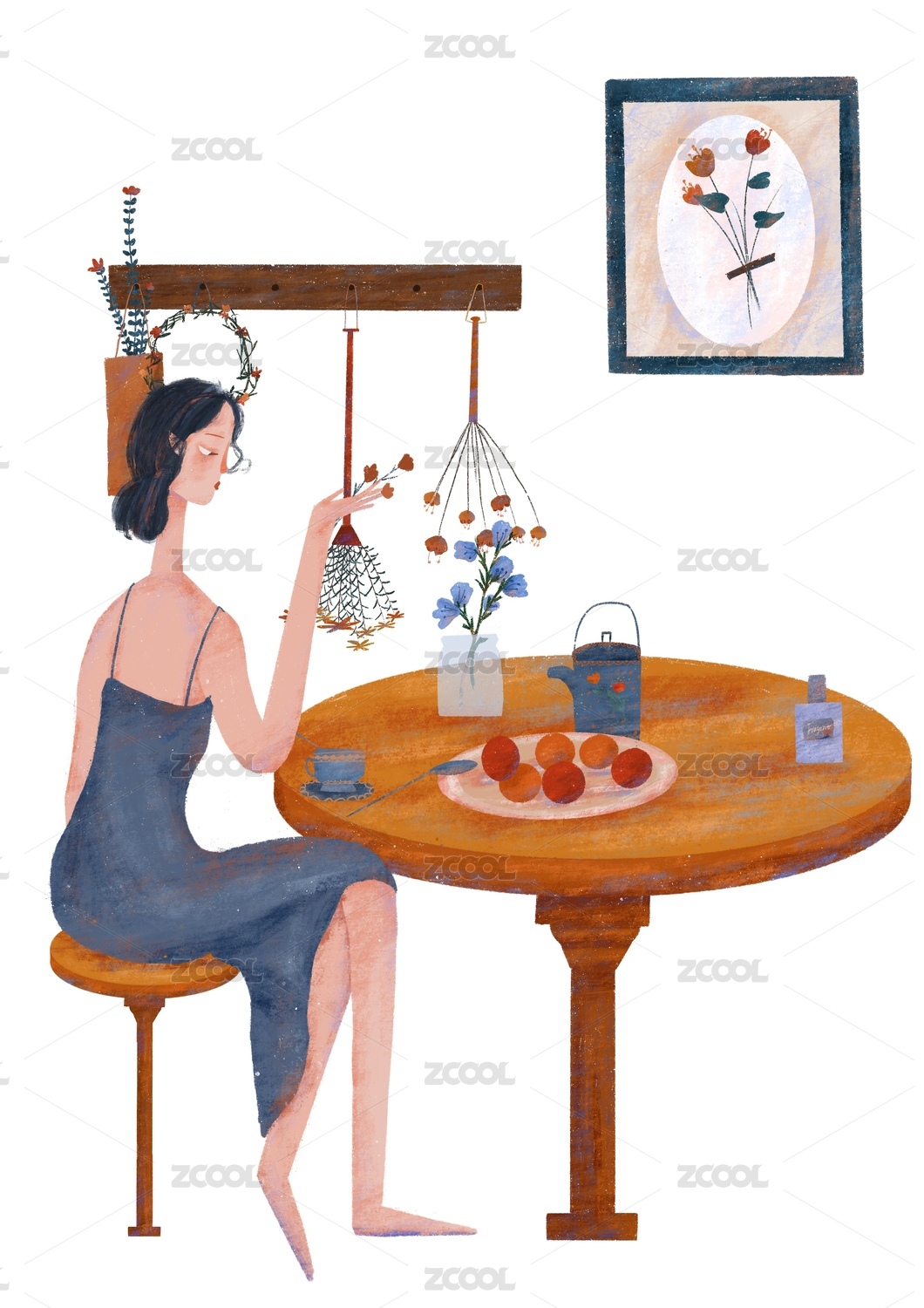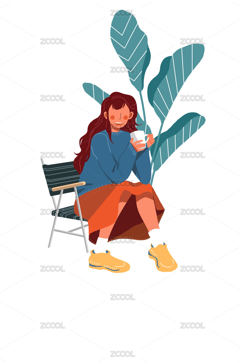 卡通手绘小雪节气冬天女孩室内喝茶插画