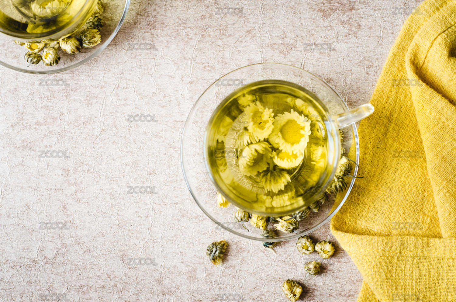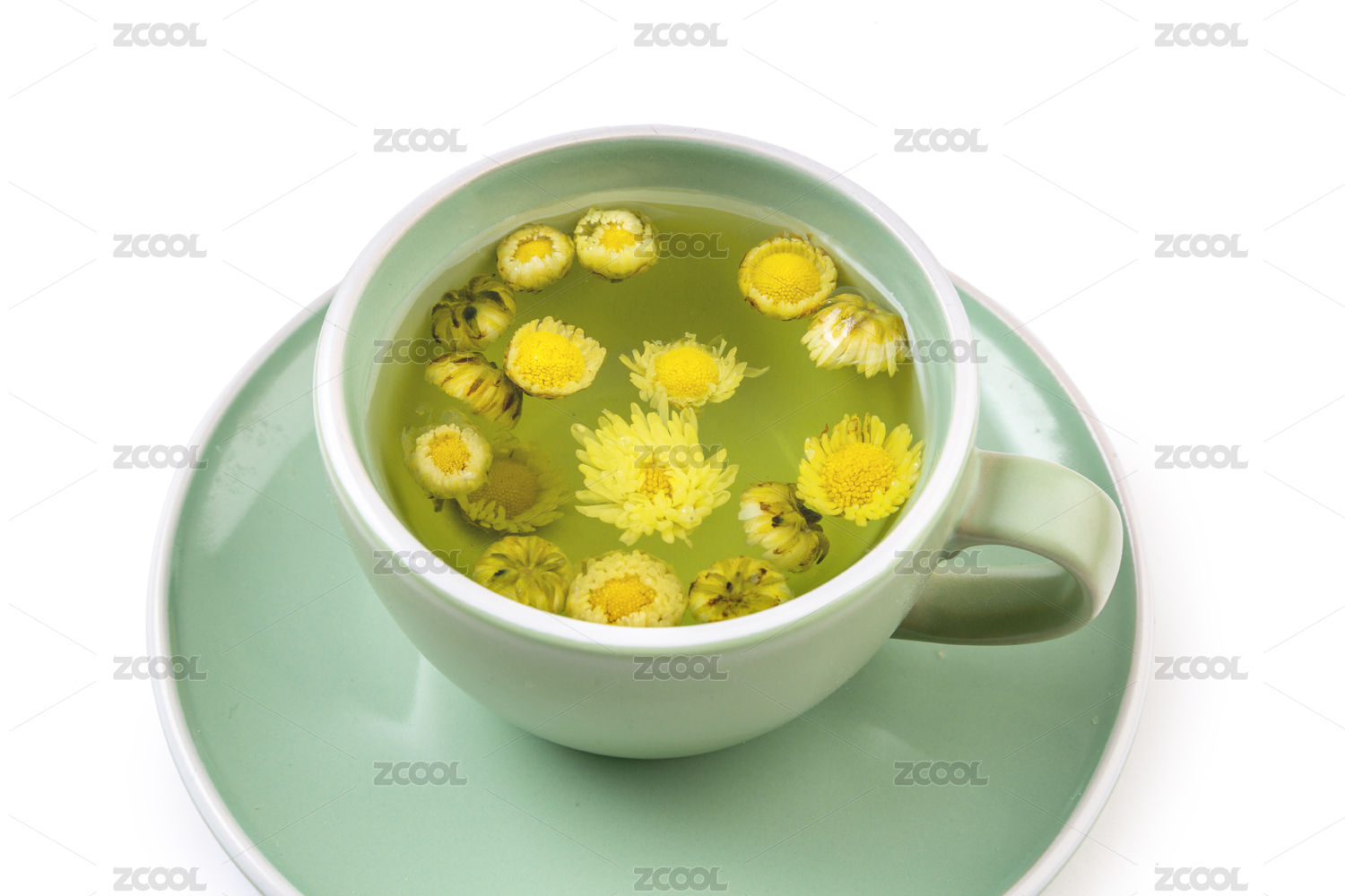 俯拍视角下,放在白色背景上泡好的菊花茶