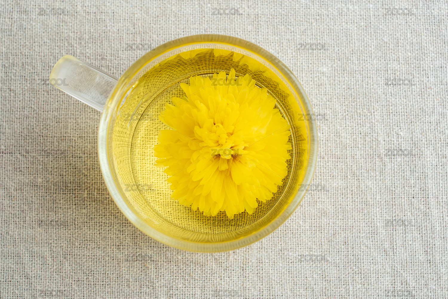 桌面上的白色面部上的玻璃杯子里的菊花茶