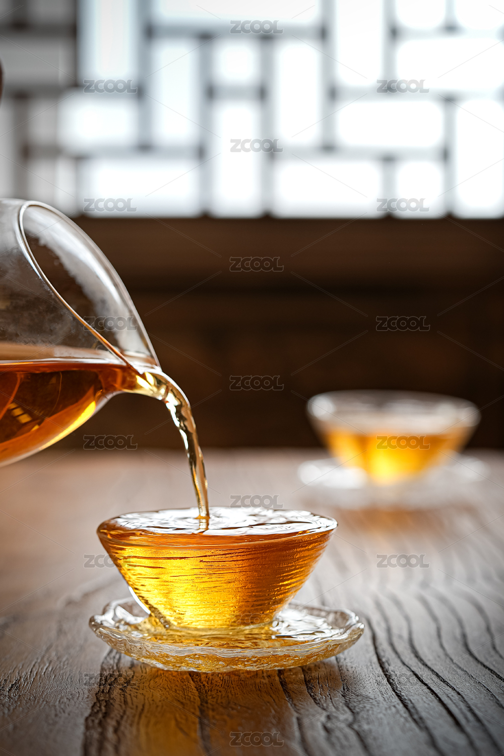 玻璃茶壶往杯里倒红褐色茶汤