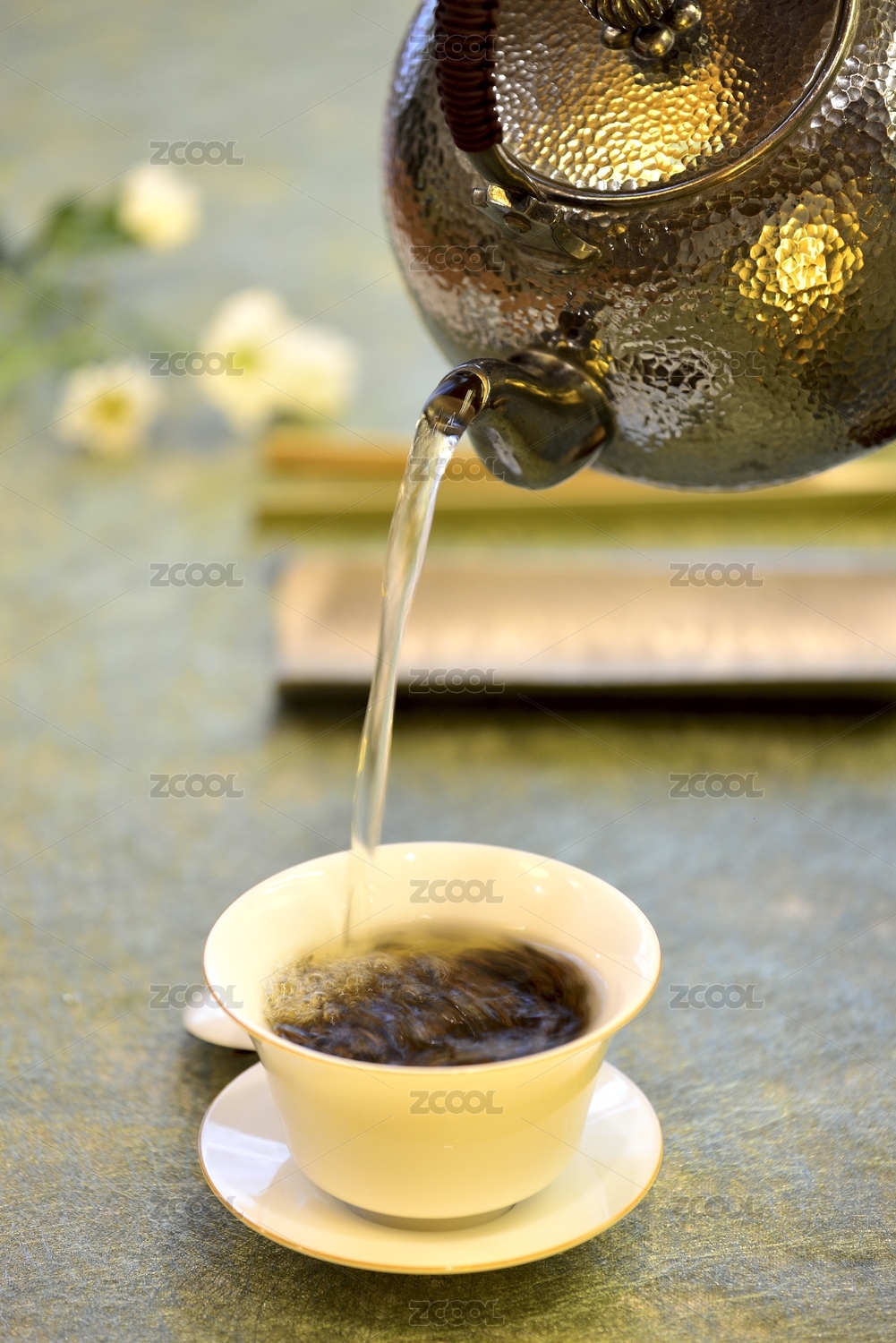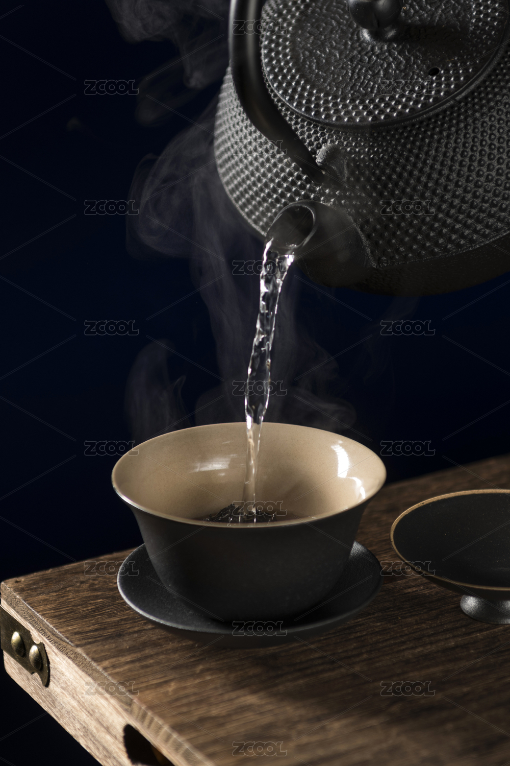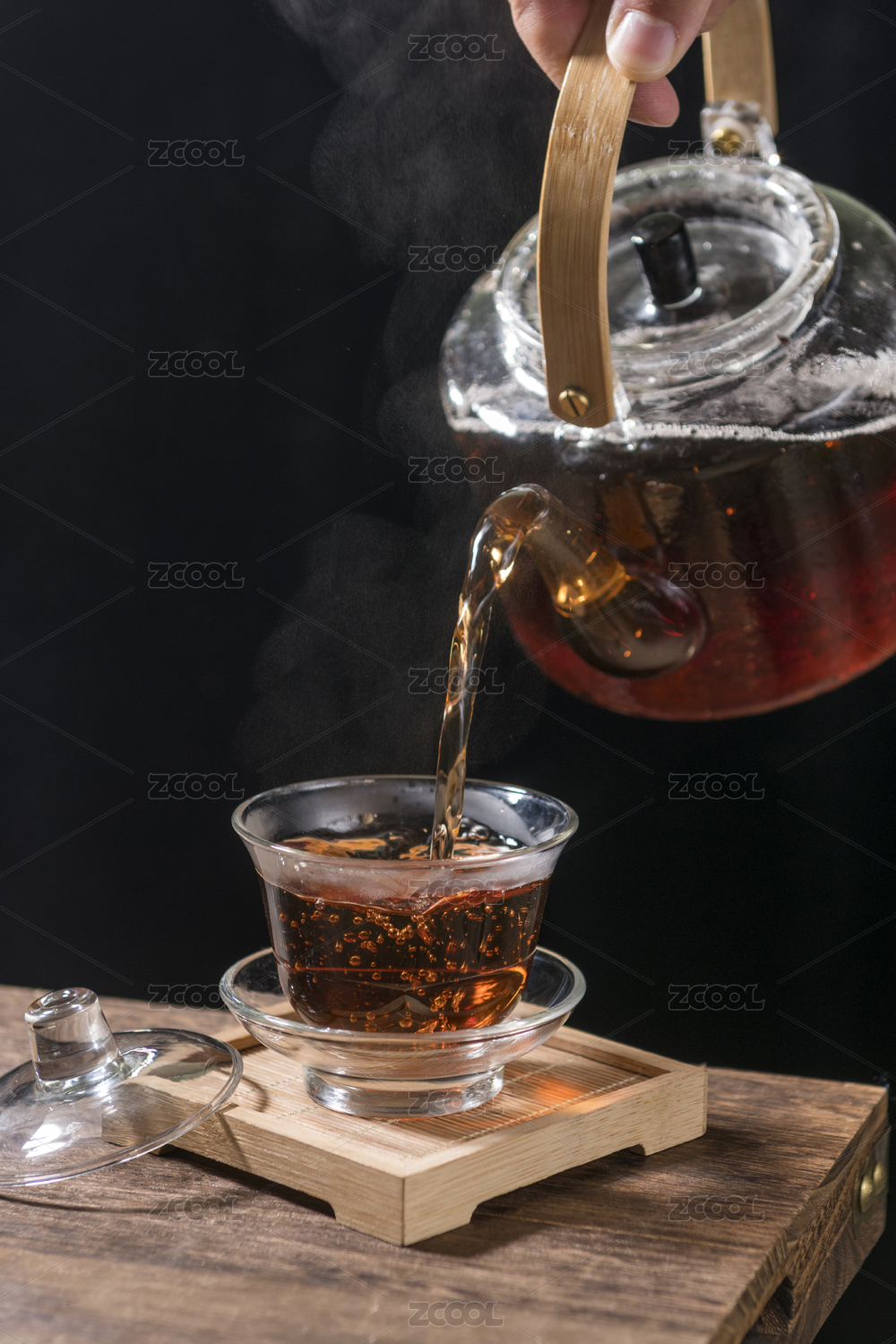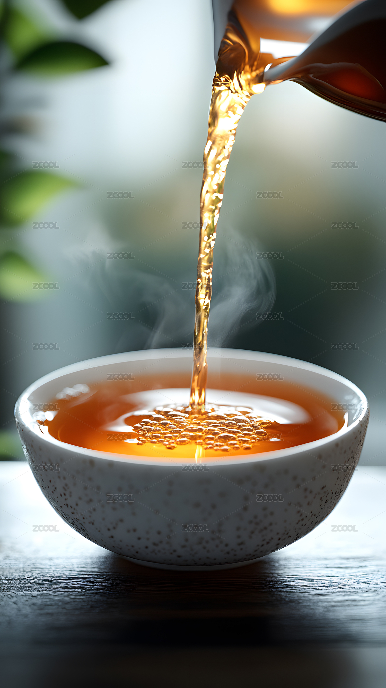 热茶倾注蒸汽袅袅