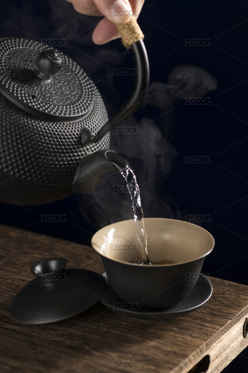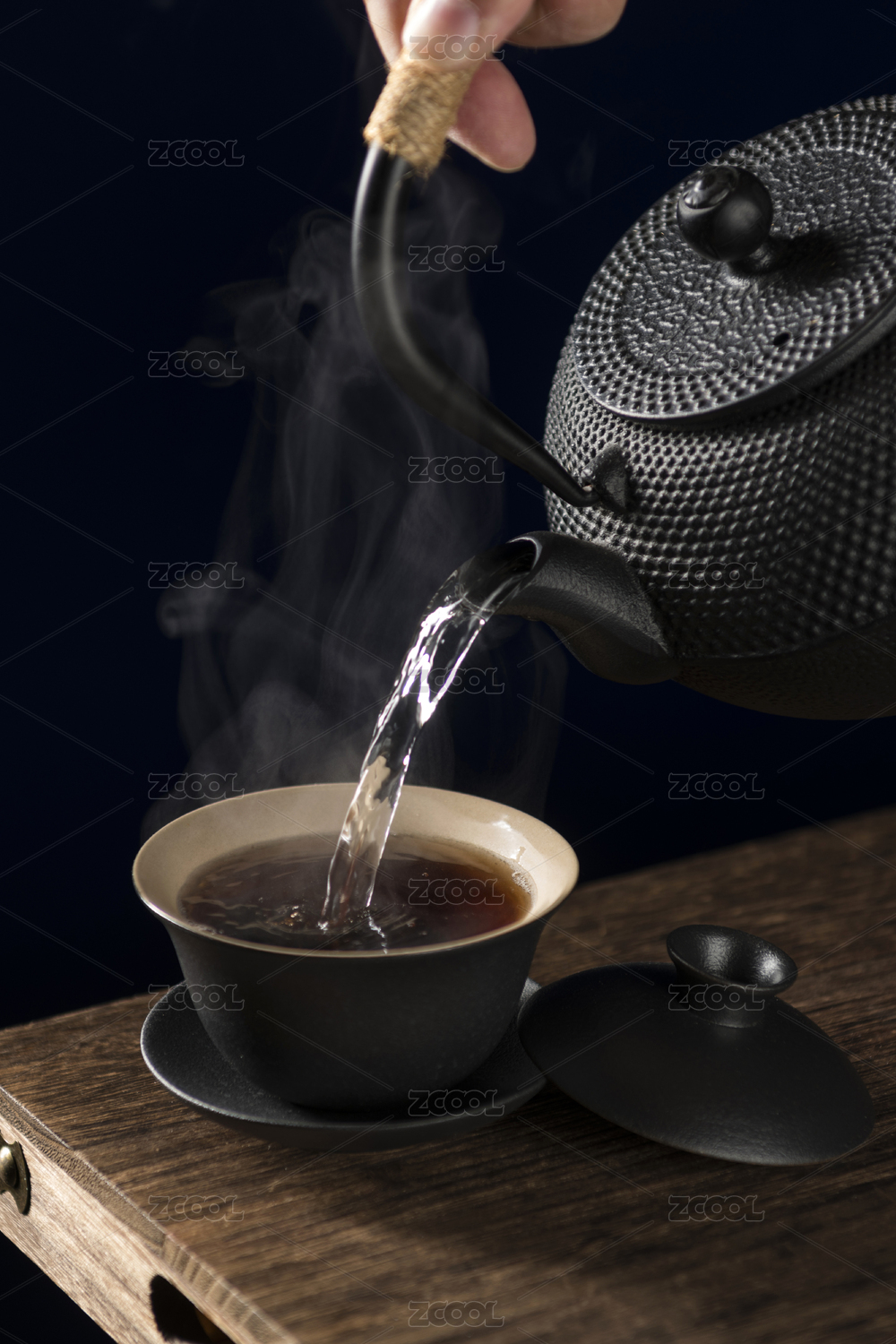 女性手持铁壶向盖碗中倒茶特写深色调
