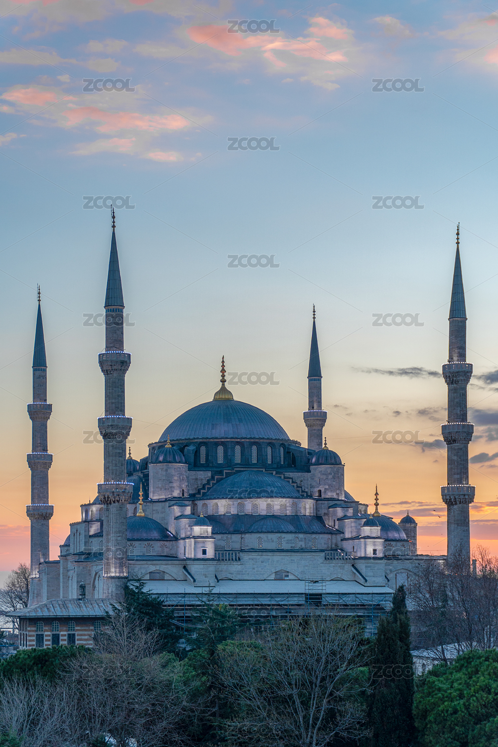 土耳其伊斯坦布尔蓝色清真寺夕阳