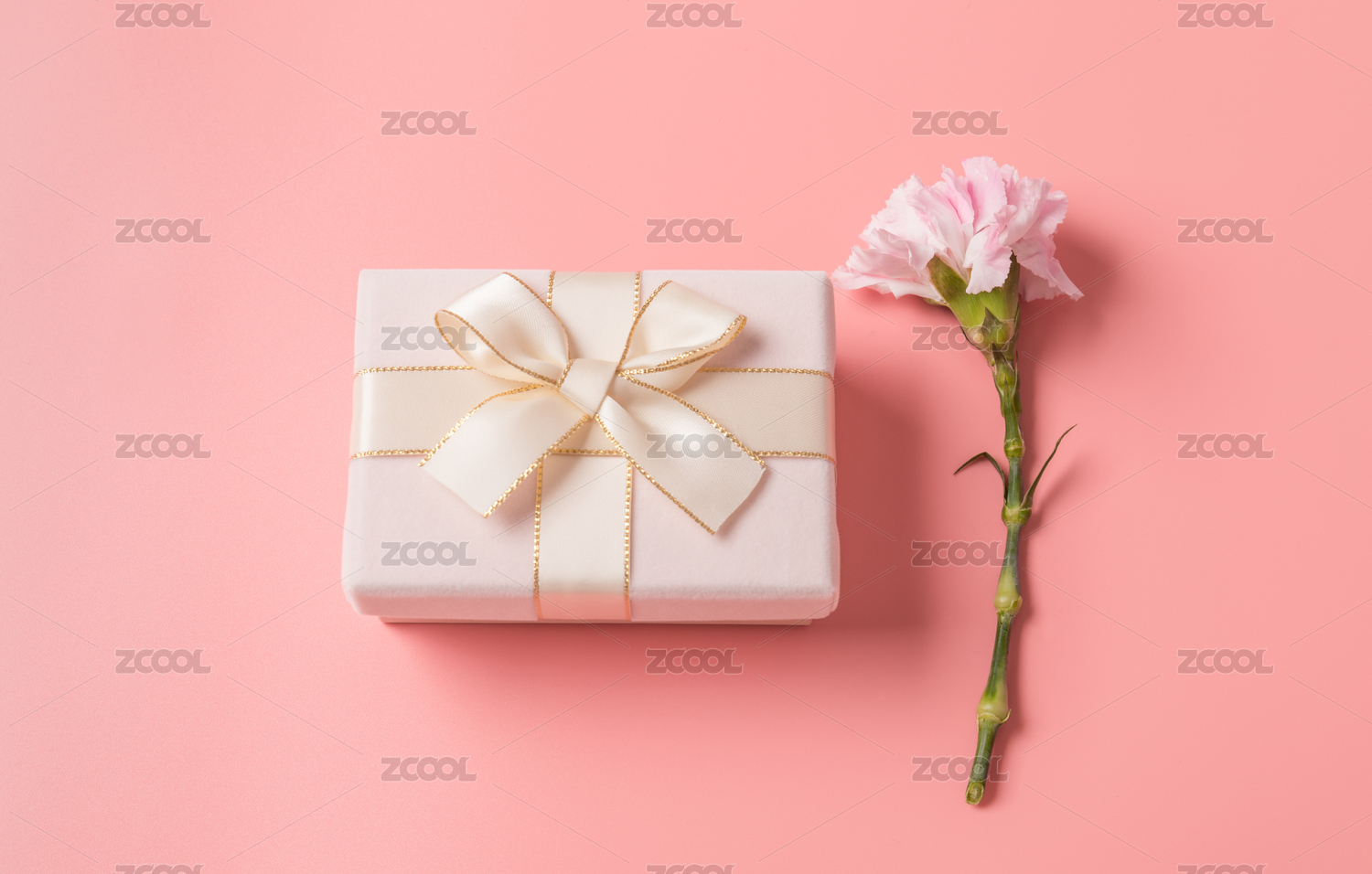 粉色背景上装有爱心的礼物盒及一枝康乃馨