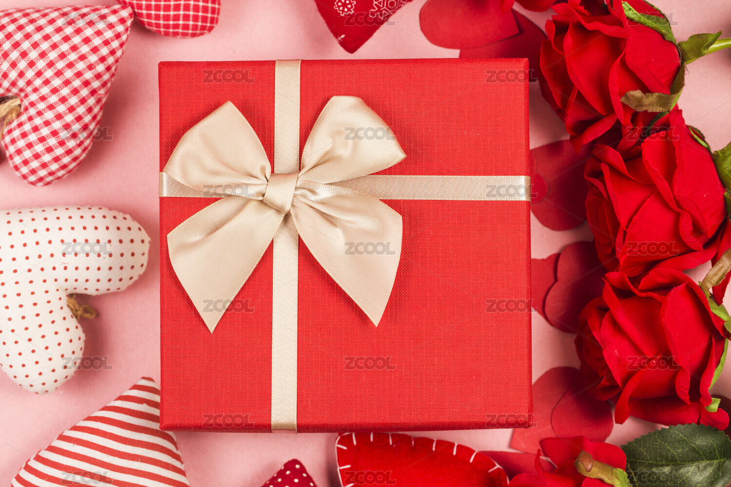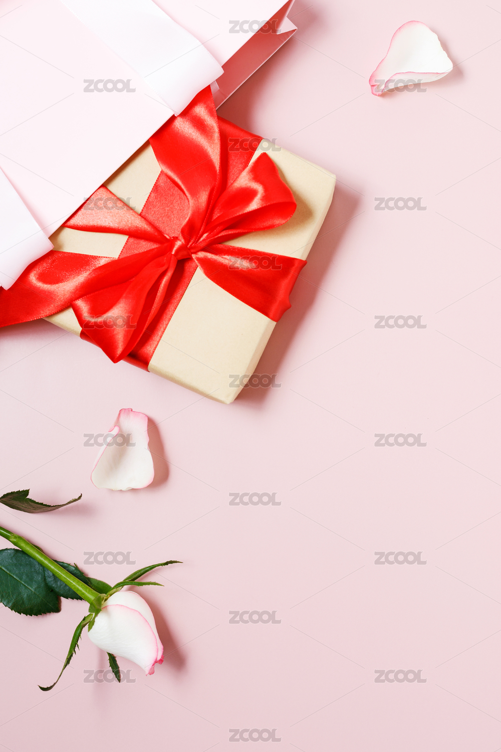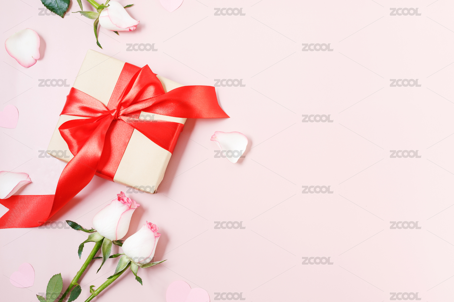 放在淡粉色背景上的玫瑰鲜花和礼物