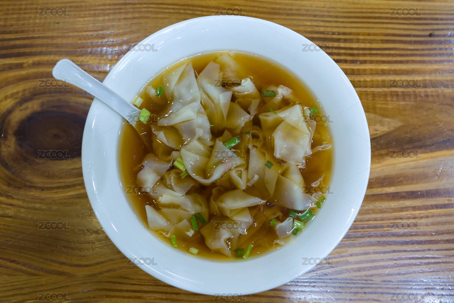 调羹从一碗小馄饨里捞起一个小馄饨的特写