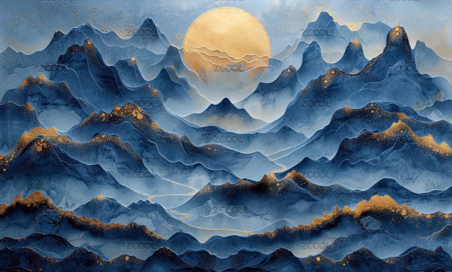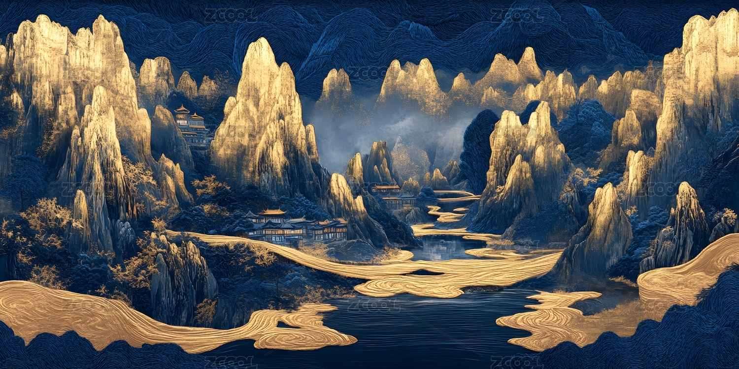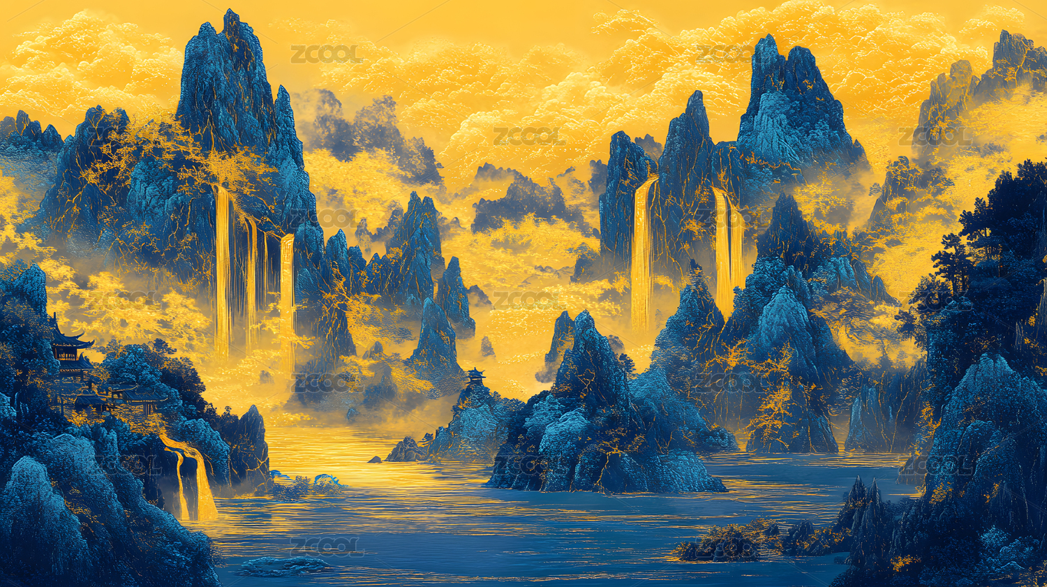 传统中国山脉青绿玉石亭台楼阁插画海报背景