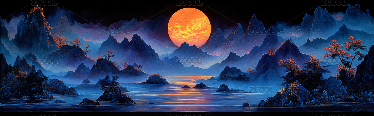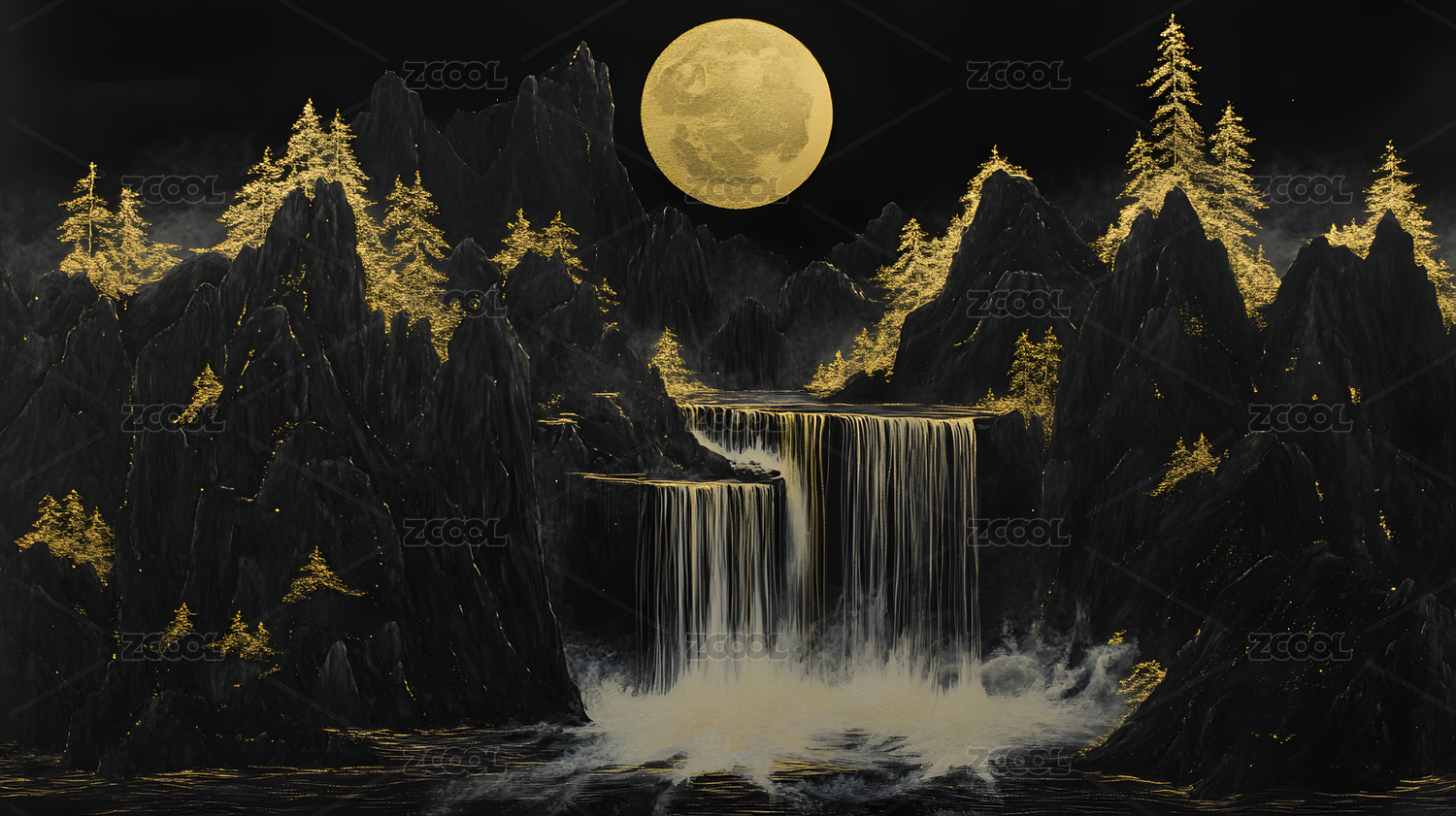 岩石山峰,宁静水面,幻想场景,尖锐岩石山峰,深灰色金色,平静水面,山脉轮廓,夜空覆盖,星空点缀,金黄色月亮