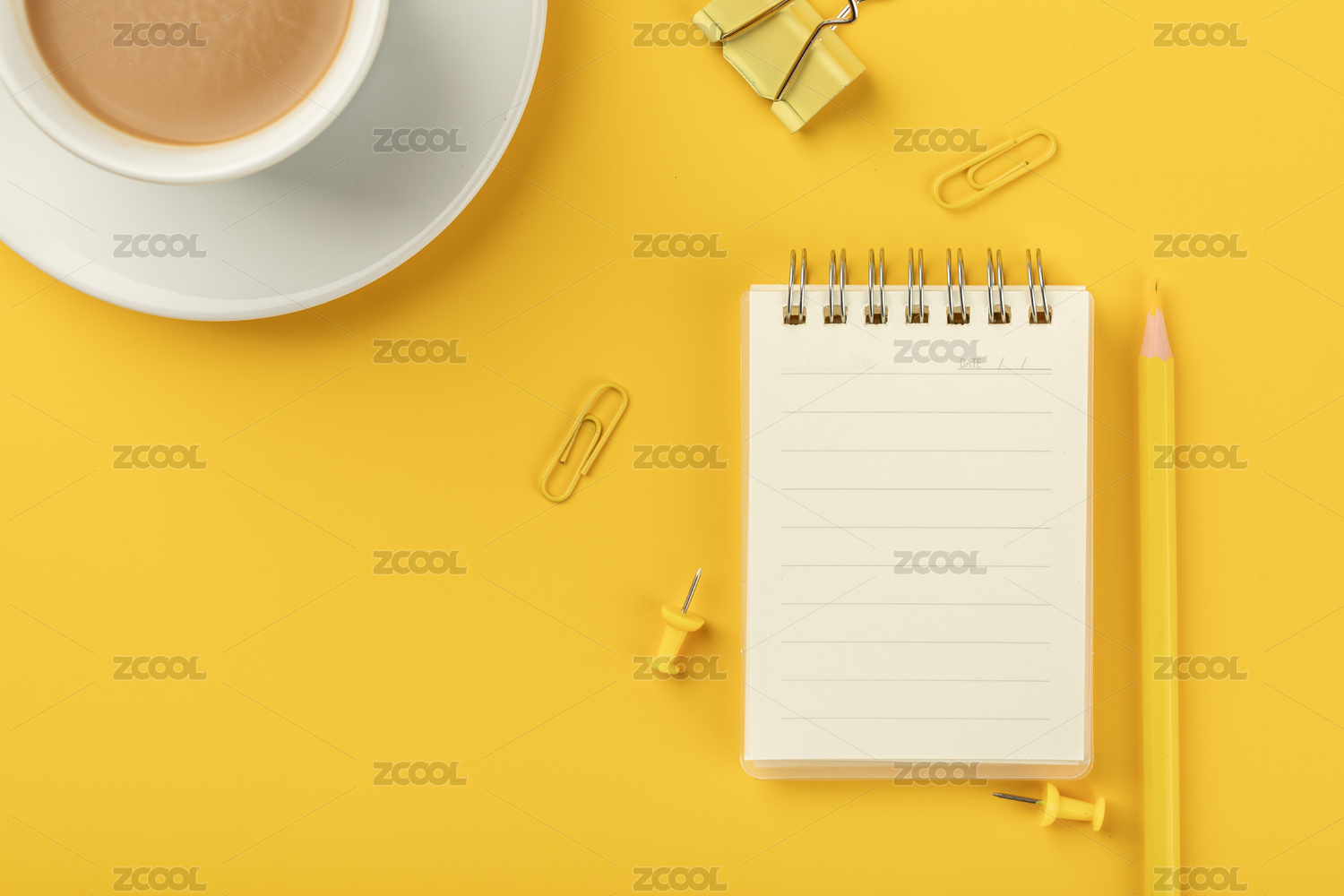 黄色背景上的咖啡杯和办公用品的高角度视图