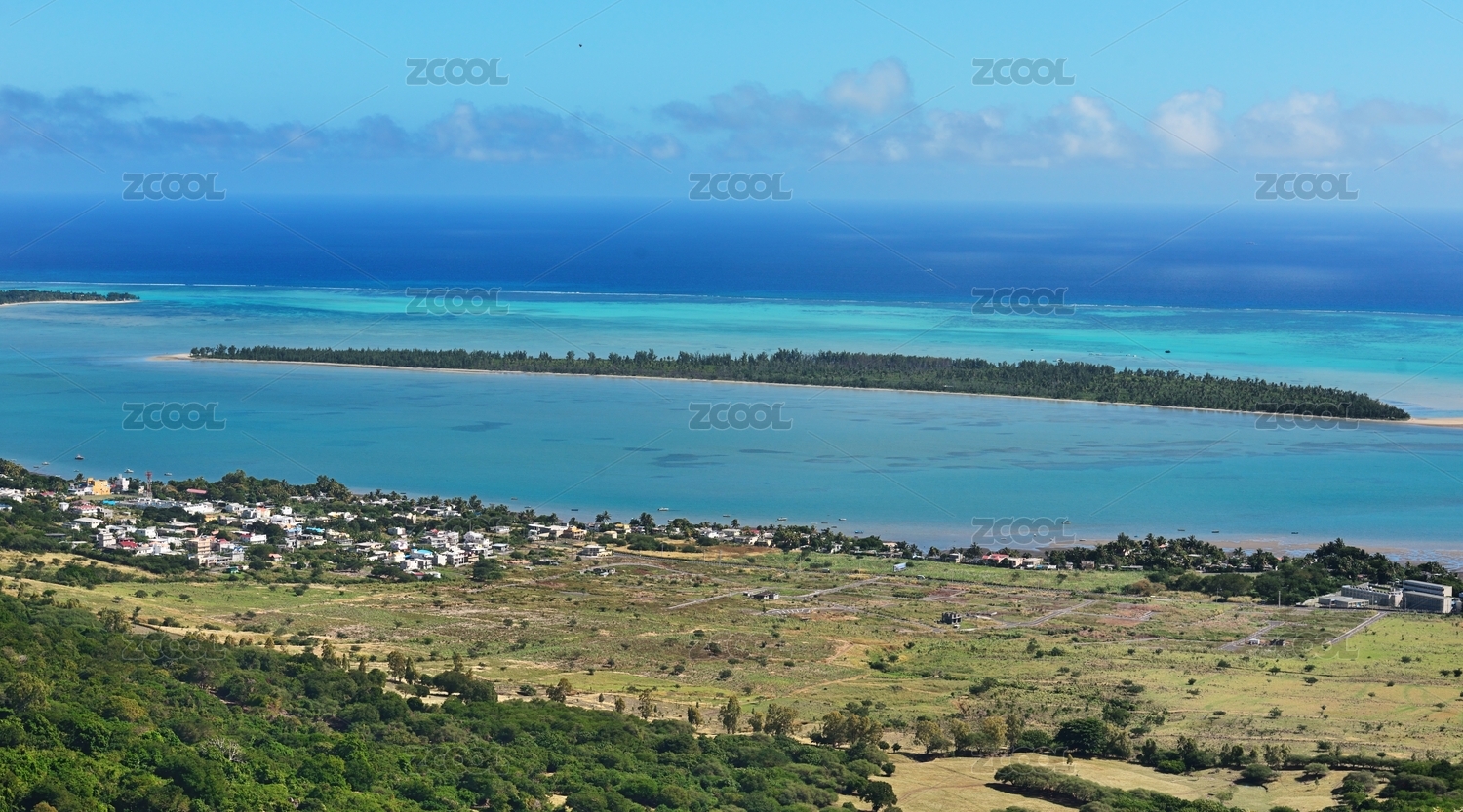 蓝天白云下的毛里求斯沙滩海岸和大海