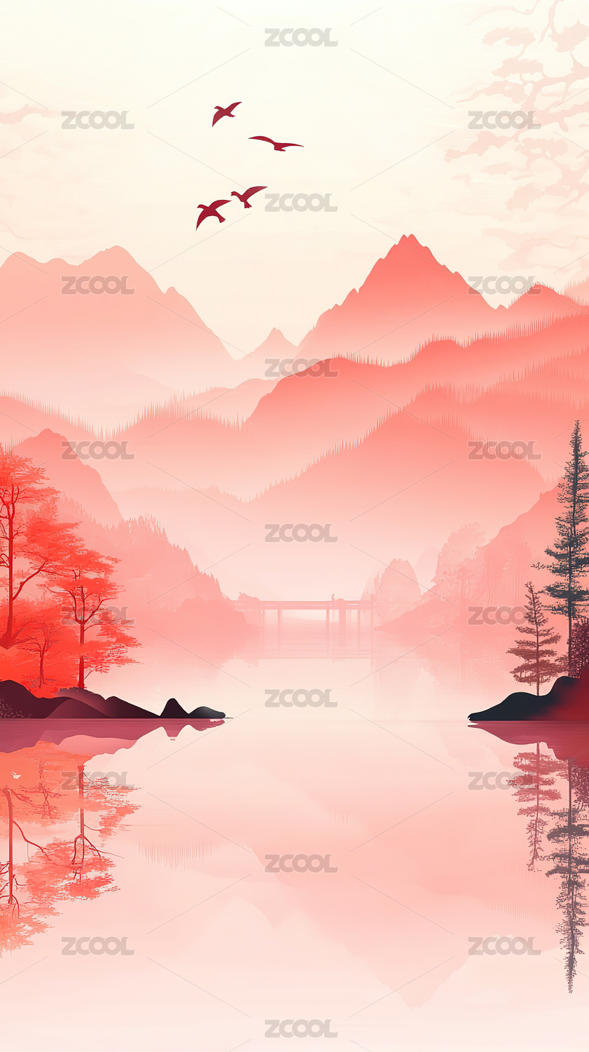 中国风水墨粉色高山插画