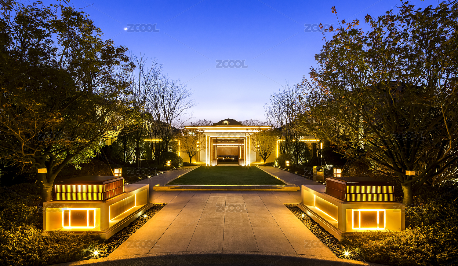 草坪造景,园林景观,高层公寓,中国,新中式景观,房地产,楼盘,建筑,无人,前景聚焦