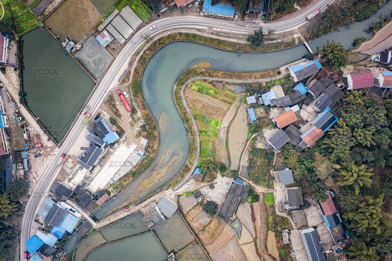 航拍初夏时节蜿蜒小河及绿色田园风光