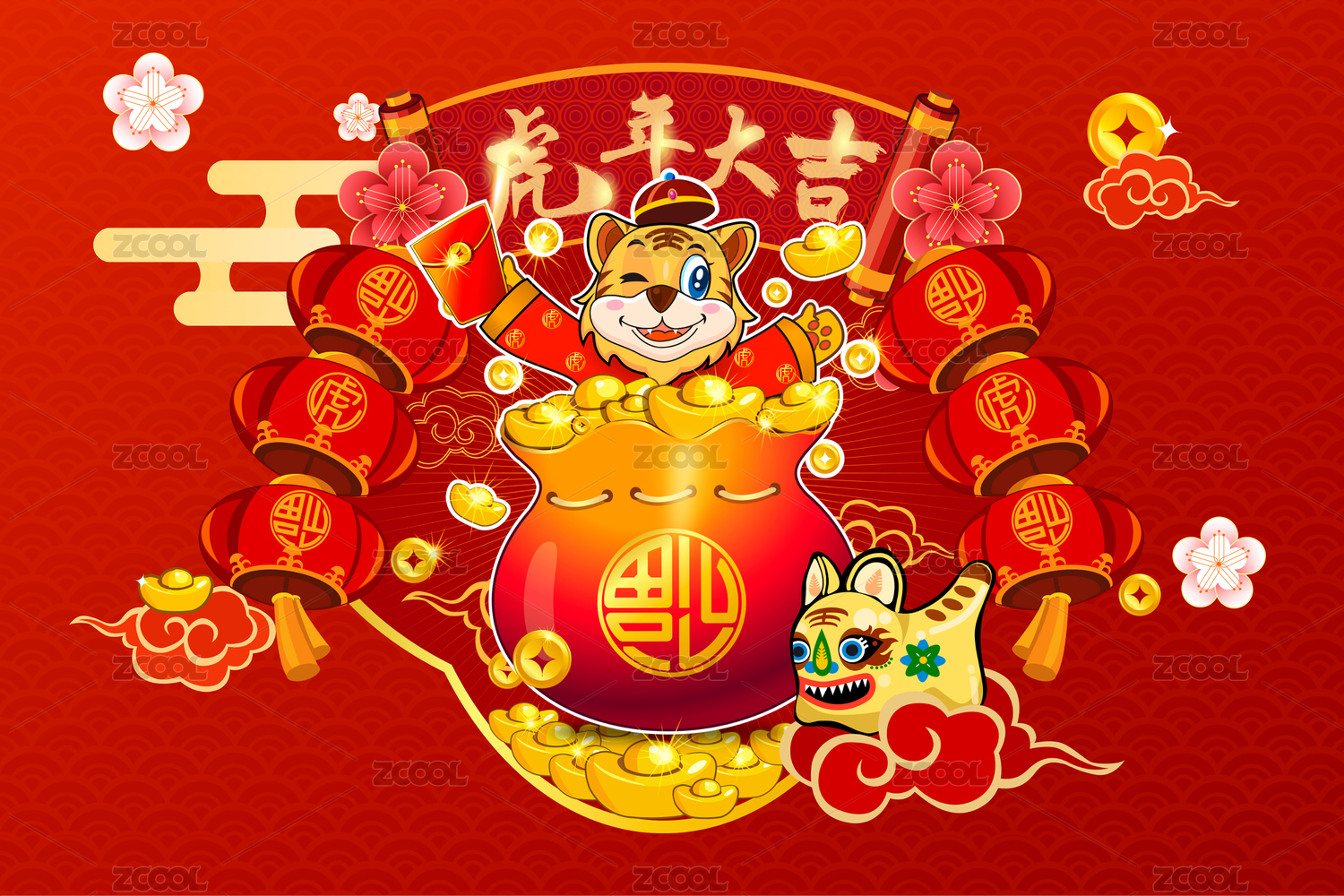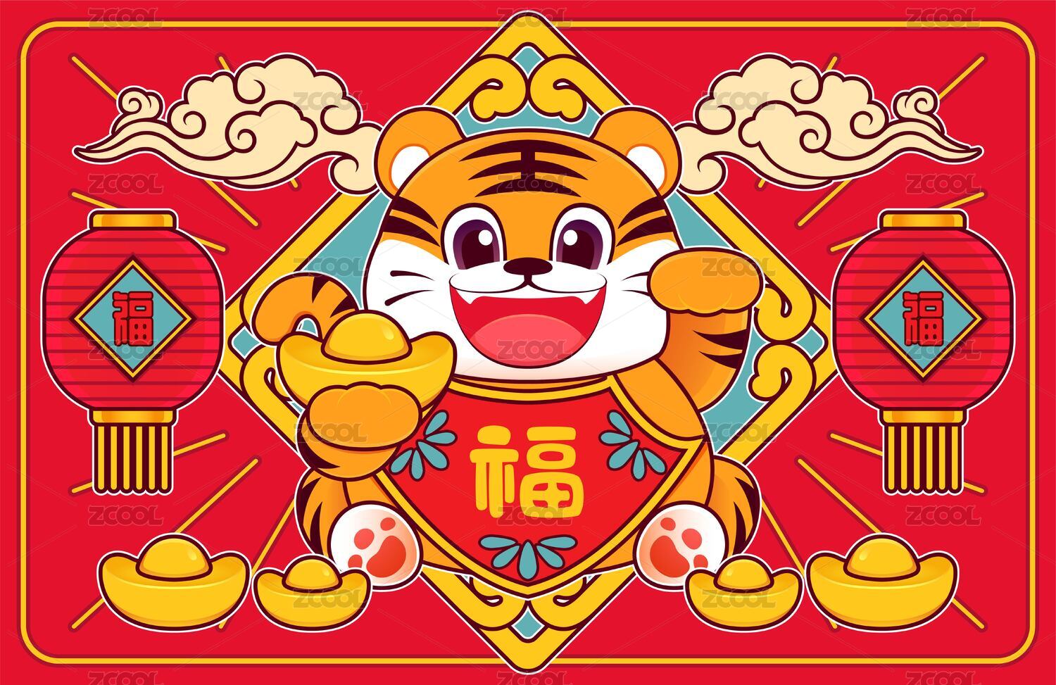 新春虎年可爱老虎恭贺新年国潮矢量插画