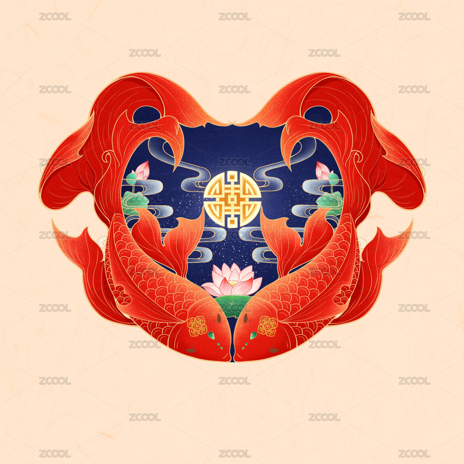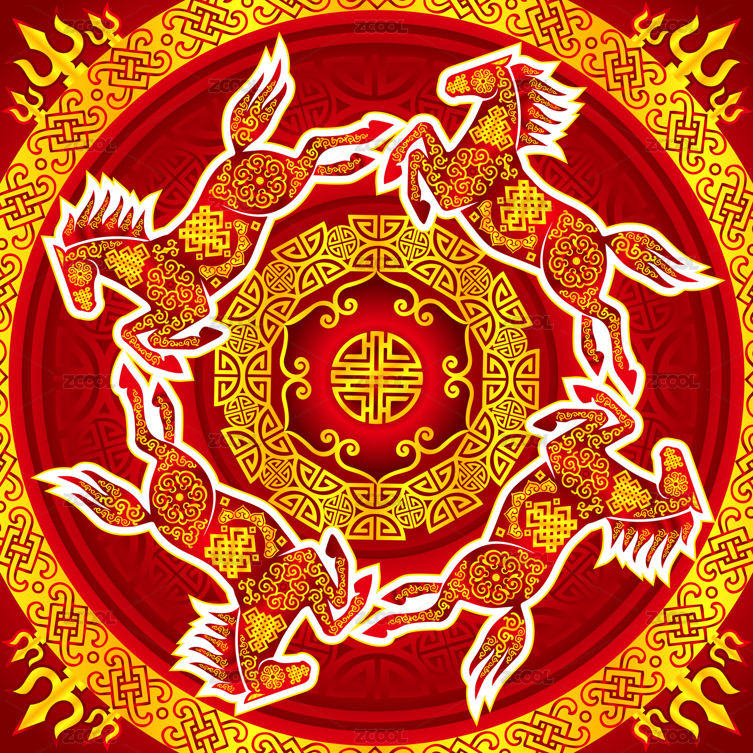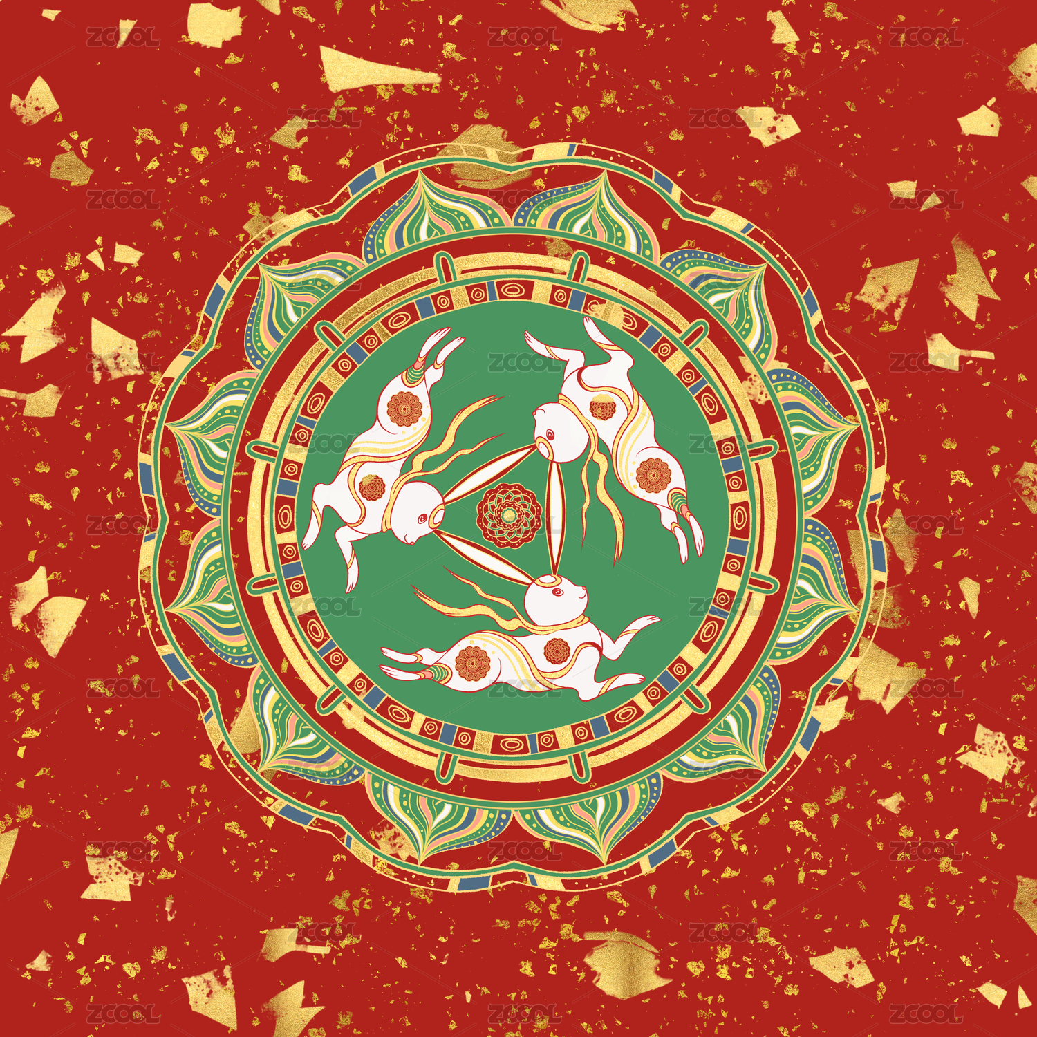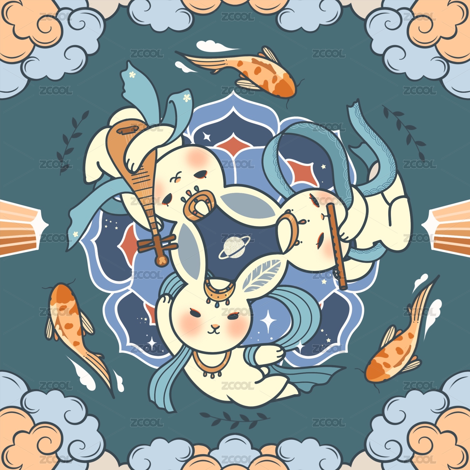 复古色三兔共耳中秋荷花锦鲤瓜果祥瑞纹样