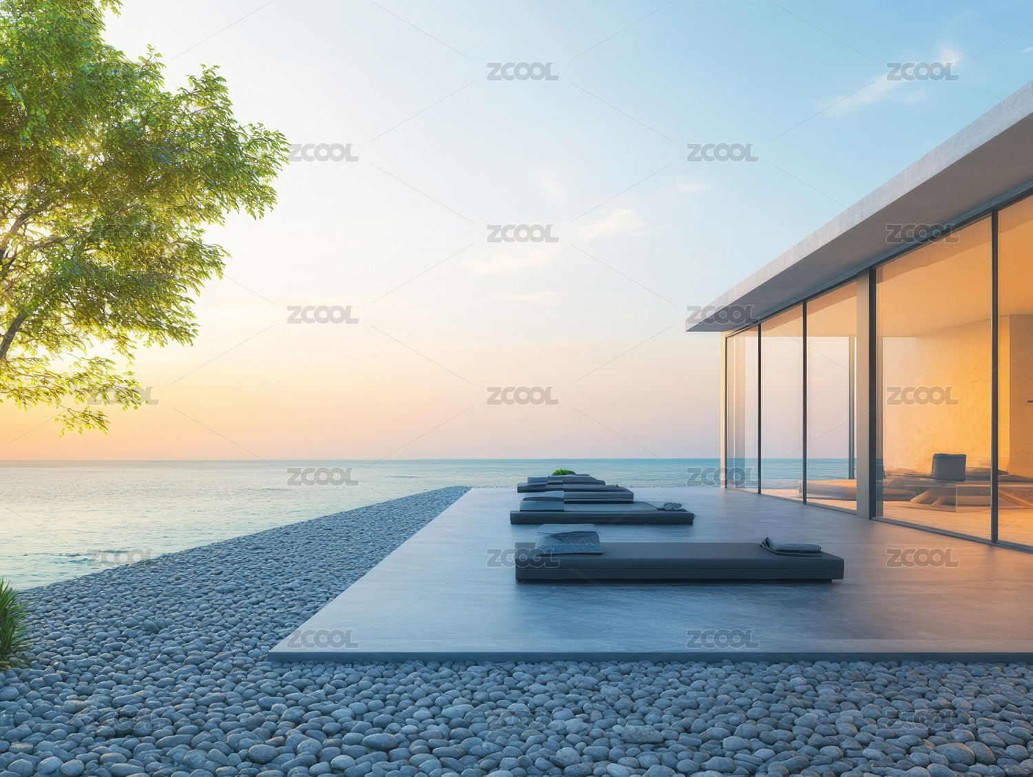 现代海滨别墅日落景观